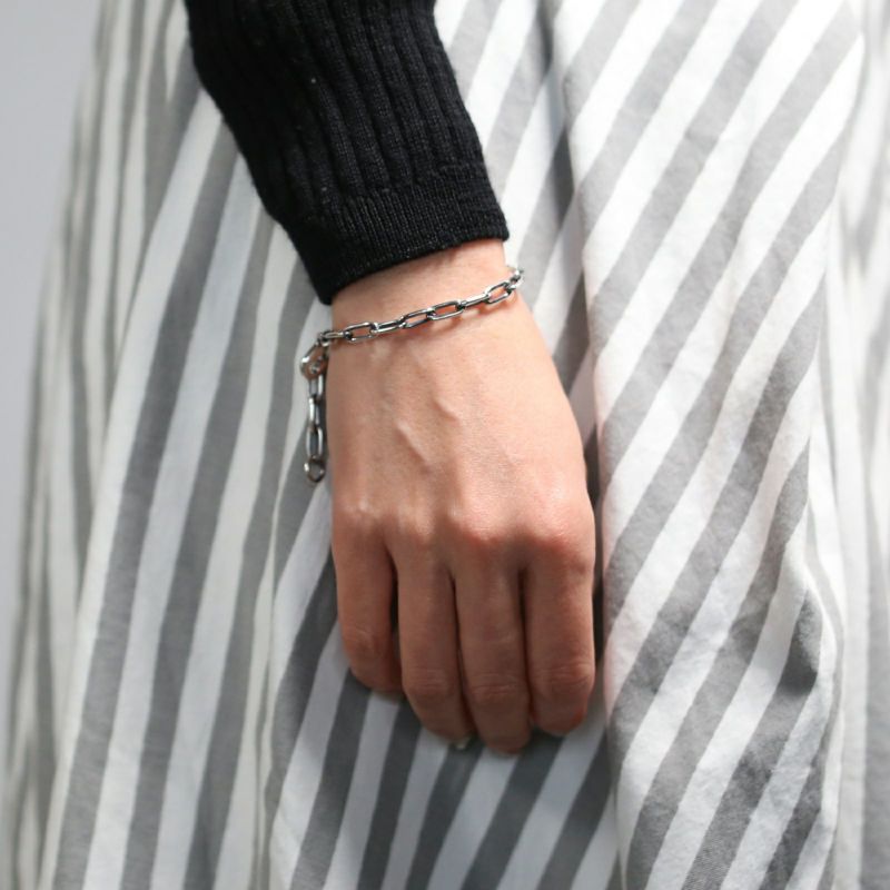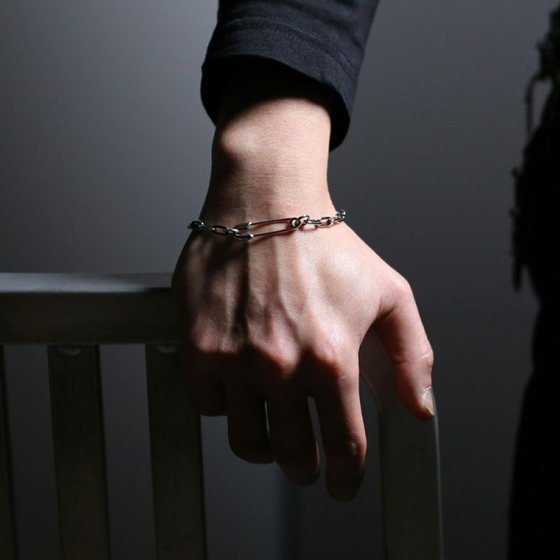 使い勝手の良い、極シンプルなチェーンブレスレットで、安全ピンは留め具としてもチャームとしても機能します。