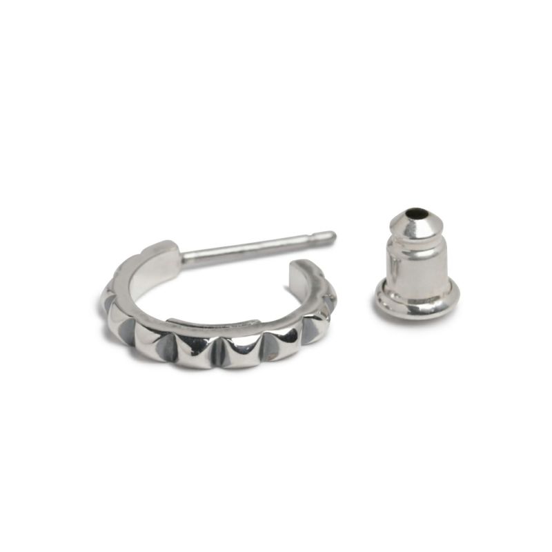 スタッズのエッジと、フープの曲線美。その相反する要素が絶妙にマッチ。男女問わずつけられるジェンダーレスデザイン。