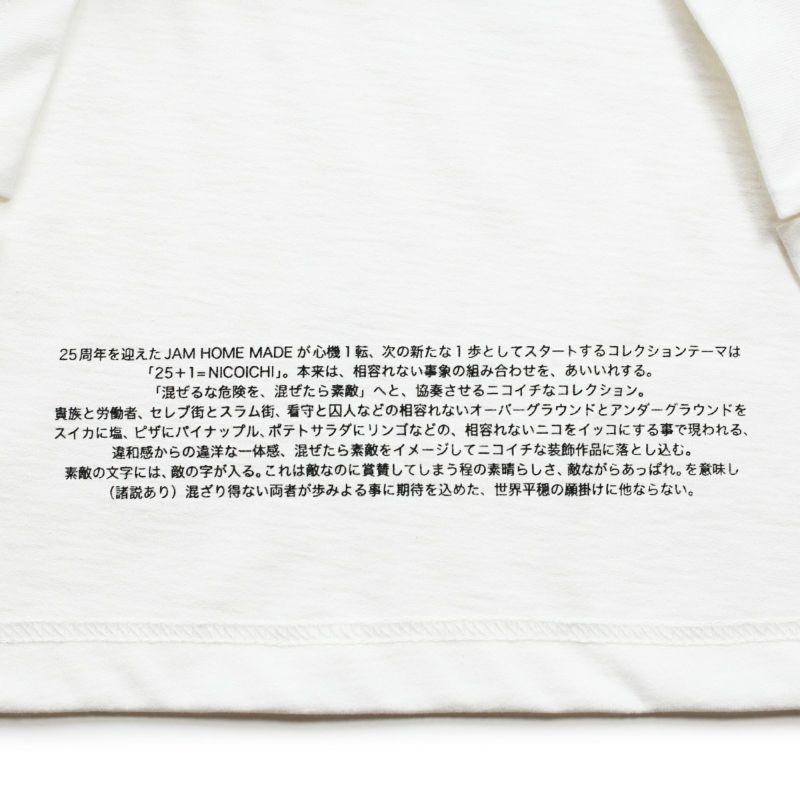 25周年を迎えたJAM HOME MADEが心機1転、次の新たな1歩としてスタートするコレクションのテーマは、25+1=NICOICHI。本来は、相いれない事象の組み合わせを、あいいれする。「混ぜるな危険を、混ぜたら素敵」へと、協奏させるニコイチなコレクション。