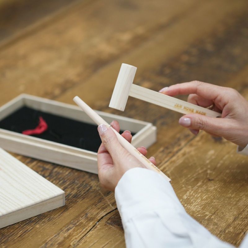 芯棒と木槌には山梨県産ひのき100%のFSC認証材を使用し、香りと温もりがものづくりの時間を豊かにします。桐箱に収められたこのキットは、誕生祝いに最適。未来に残る“愛の証”として、小さなリングに永遠の記憶を刻みます。