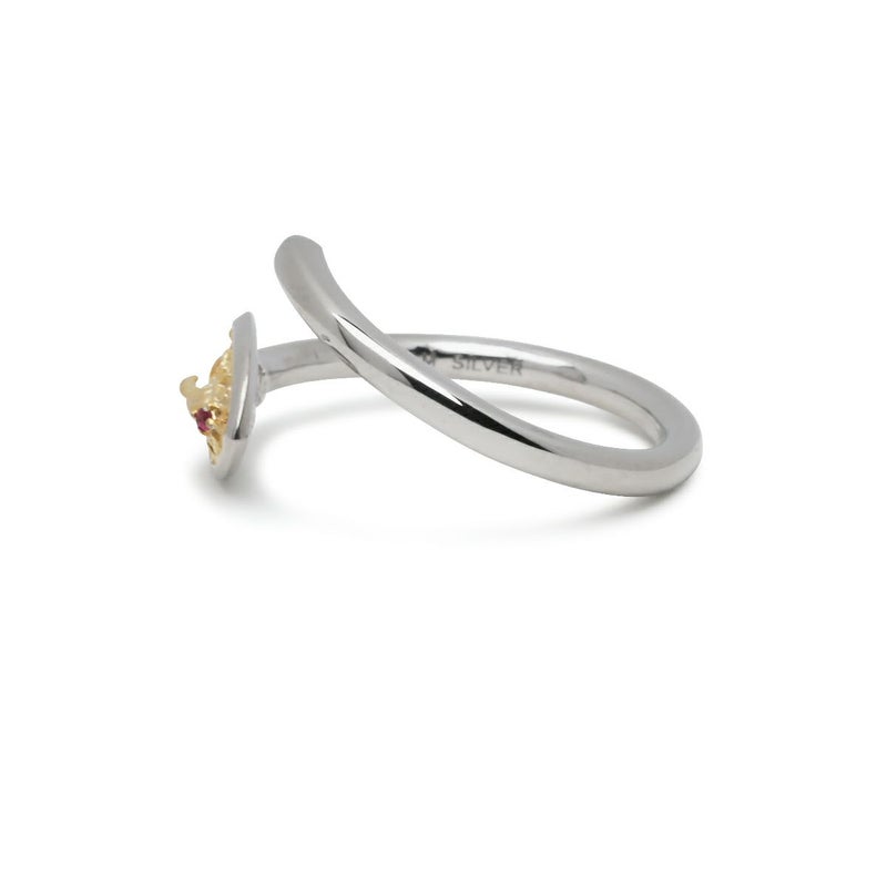 ゴールドとシルバーのコンビネーションカラーと天然ルビーを留めることで、シルバージュエリーとしての美しさを演出しました。
