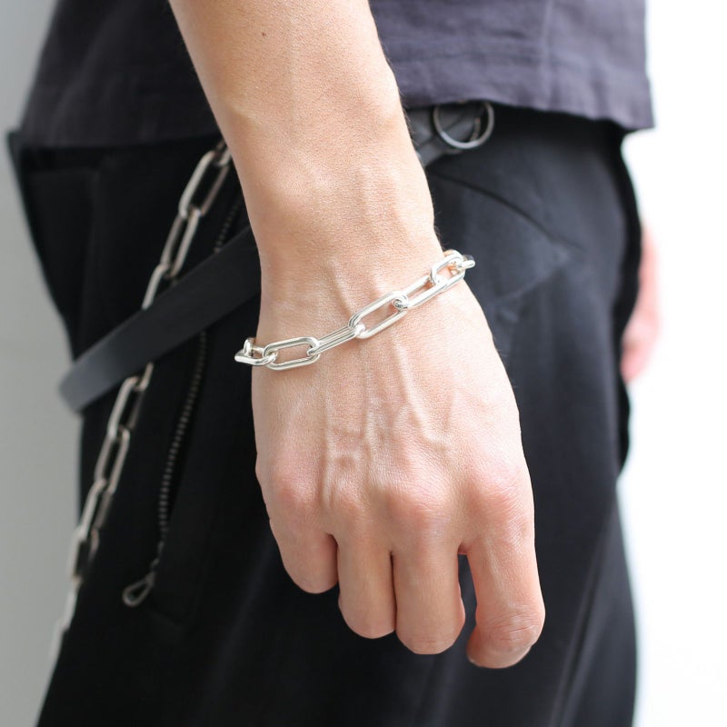 チェーンは、重厚感のあるシンプルなブレスレットに、素材をシルバーに変更し、価値のある装飾品へと昇華させた。