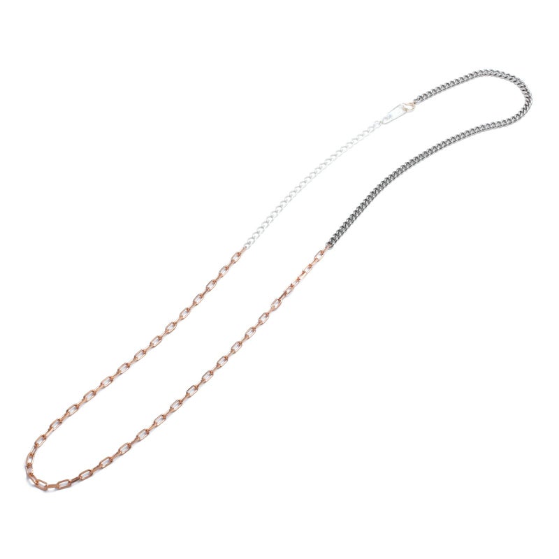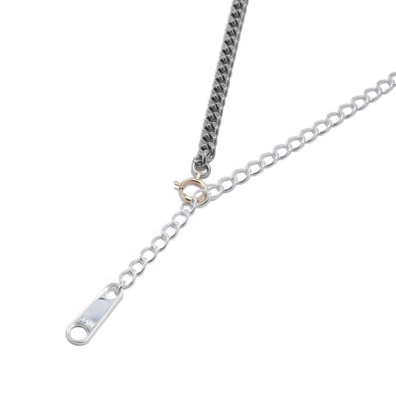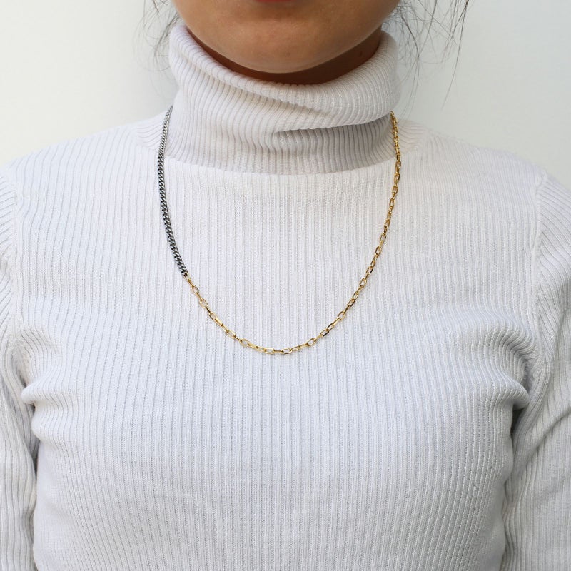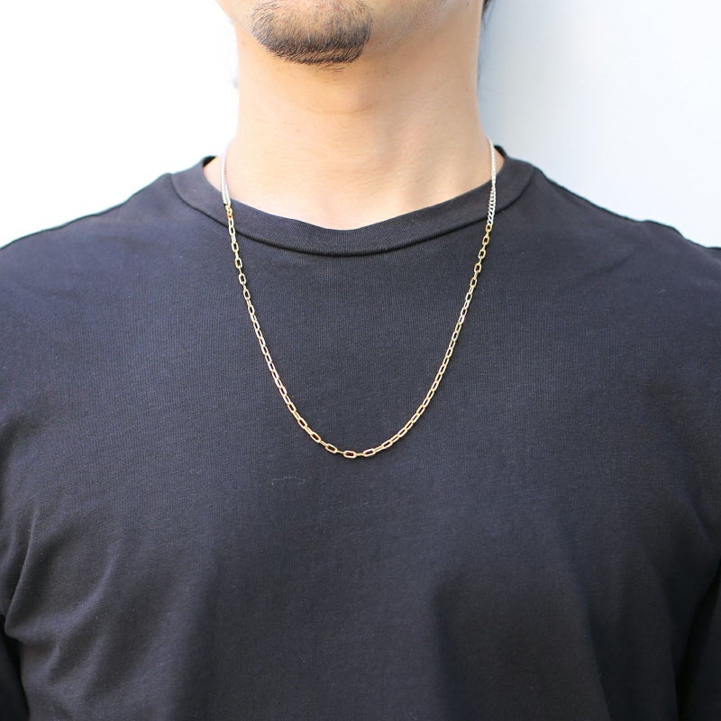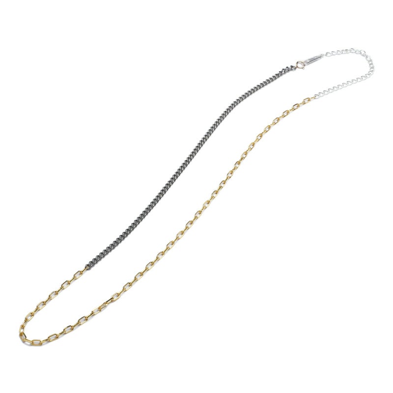 4つの素材(10K,SILVER925,SUS,BRASS)を用いて、ゴールドカラー/シルバーカラーのコンビネーションのチェーンネックレスに仕上げました。