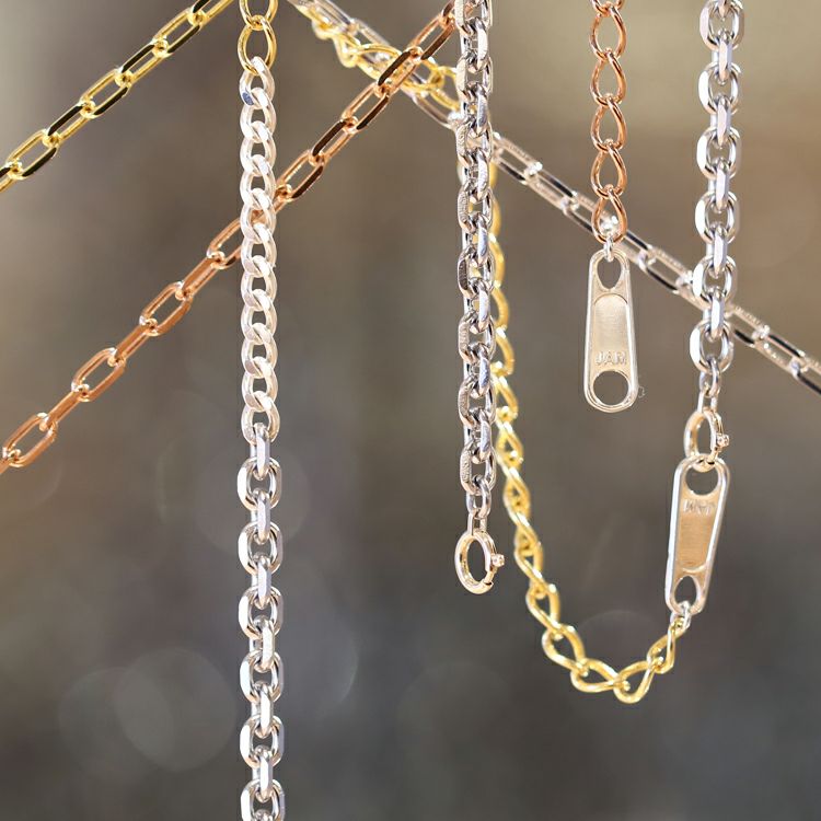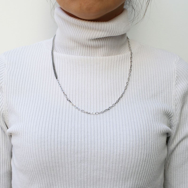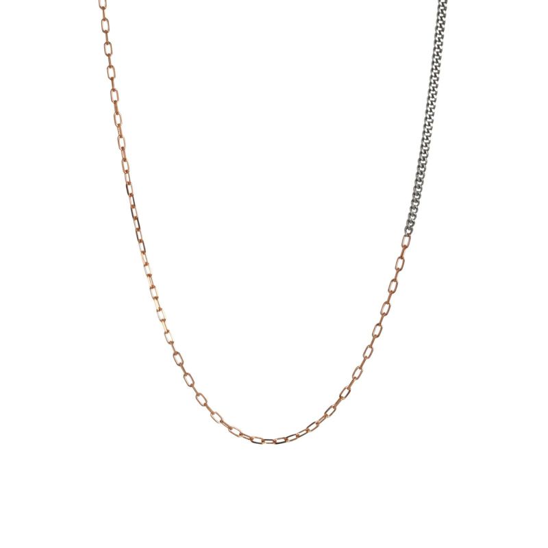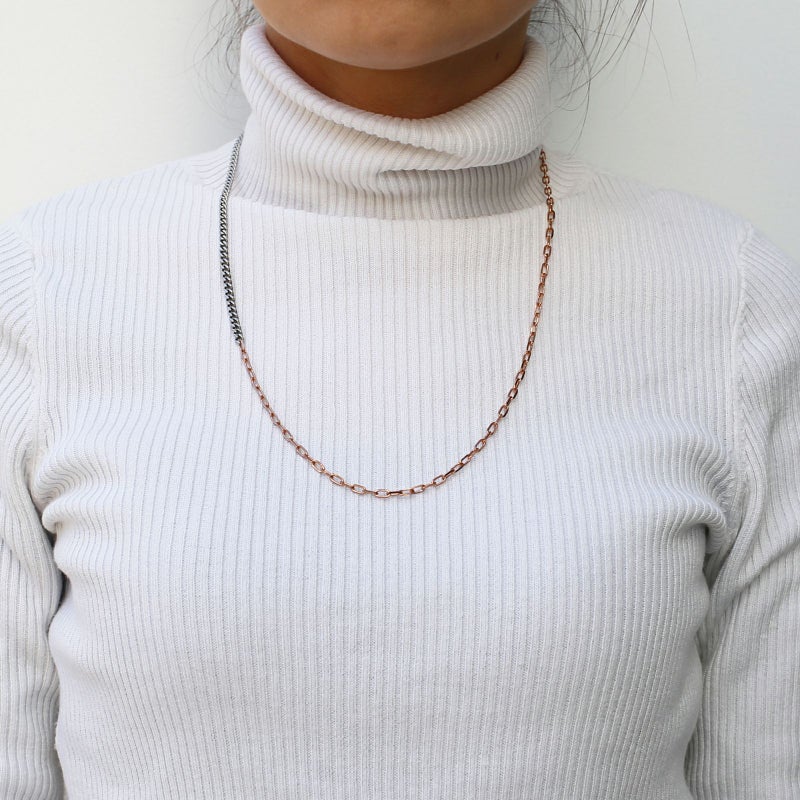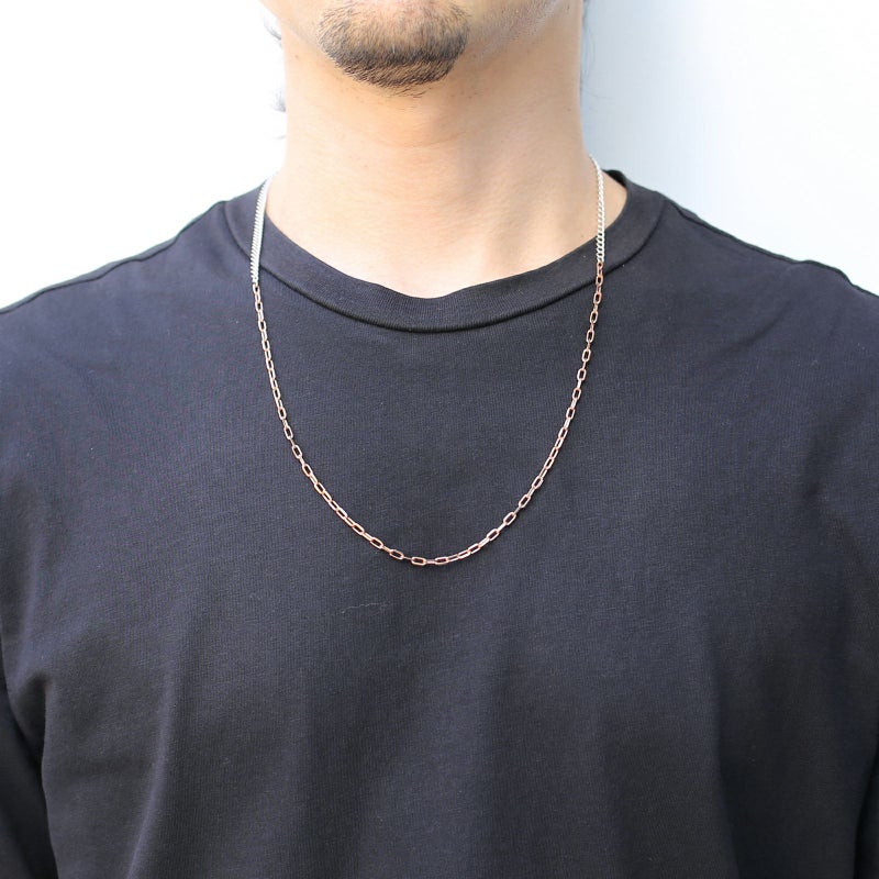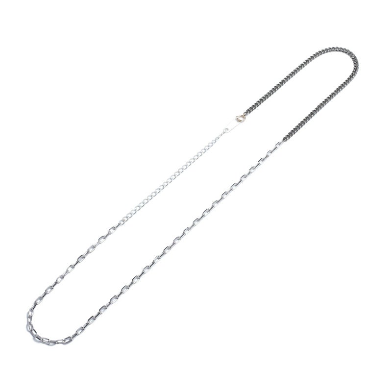4つの素材(10K,SILVER925,SUS,BRASS)を用いて、ゴールドカラー/シルバーカラーのコンビネーションのチェーンネックレスに仕上げました。
