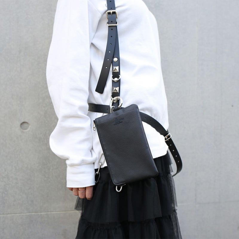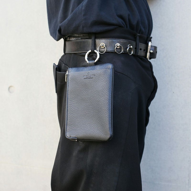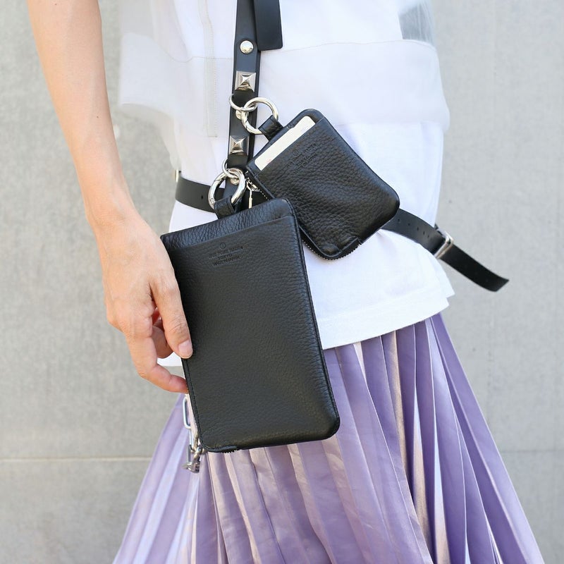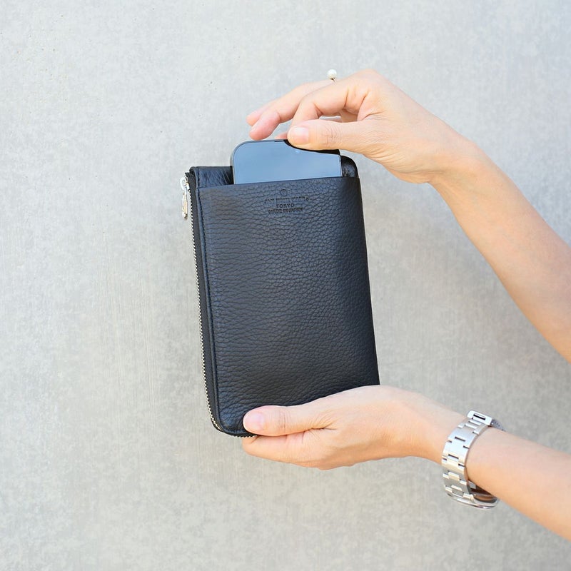 長財布としてもポーチとしても使える縦 11 × 横 17 (cm)の10,000円札がぴったり入るサイズ感。スマホも外側・内側に収納可能。