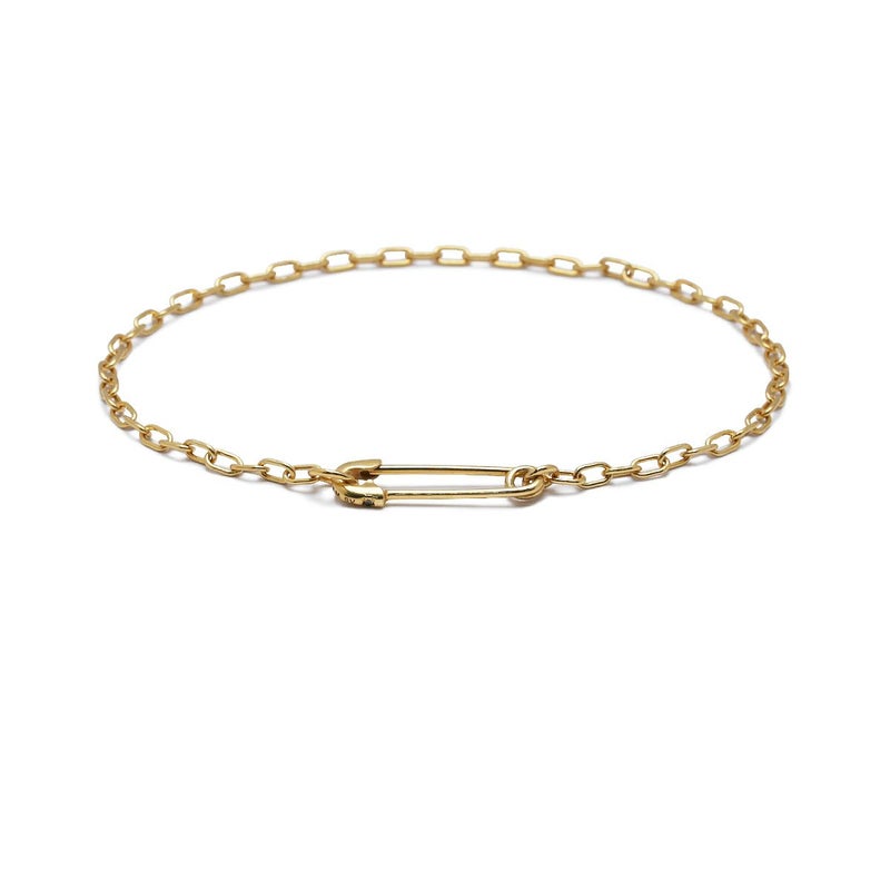 使い勝手の良い、極シンプルなチェーンブレスレットで、安全ピンは留め具としてもチャームとしても機能します。