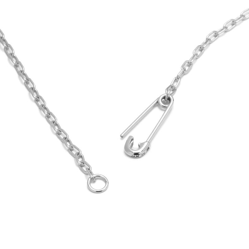 使い勝手の良い、極シンプルなチェーンネックレスで、安全ピンは留め具としてもチャームとしても機能します。