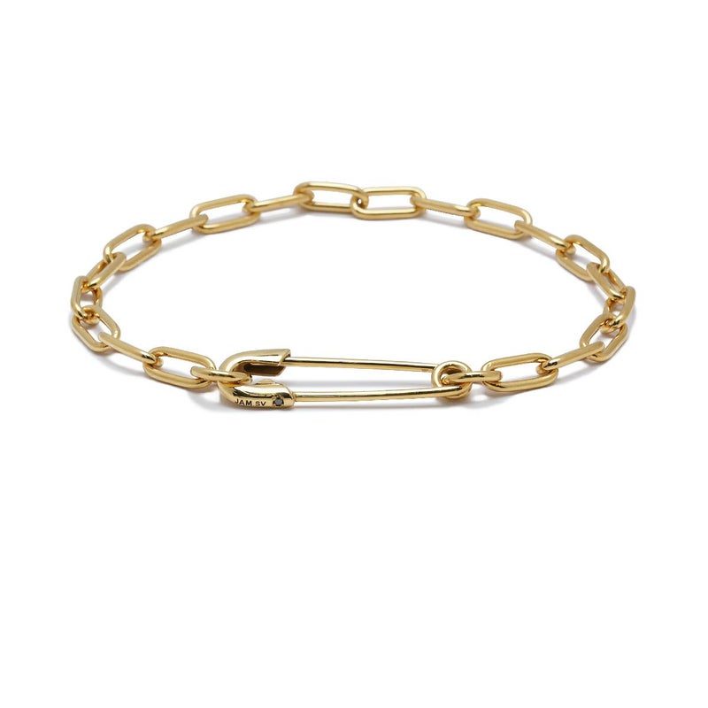 使い勝手の良い、極シンプルなチェーンブレスレットで、安全ピンは留め具としてもチャームとしても機能します。