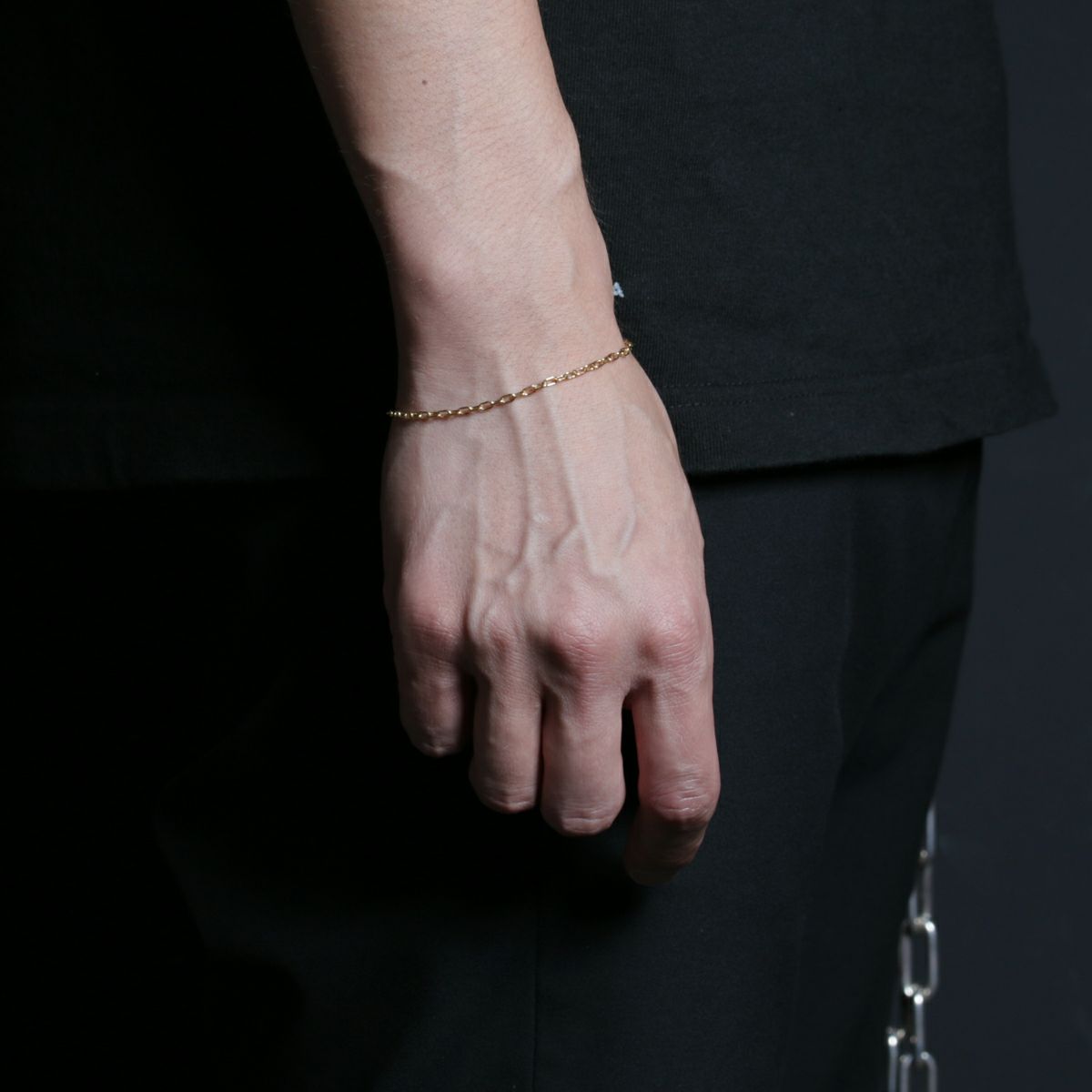 使い勝手の良い、極シンプルなチェーンブレスレットで、安全ピンは留め具としてもチャームとしても機能します。