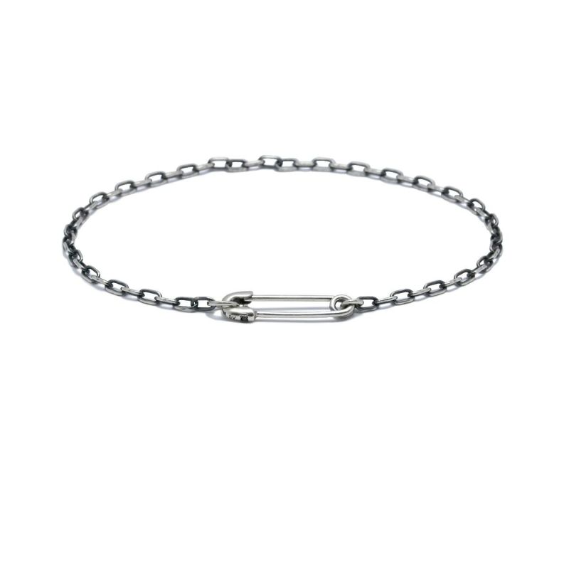使い勝手の良い、極シンプルなチェーンネックレスで、安全ピンは留め具としてもチャームとしても機能します。