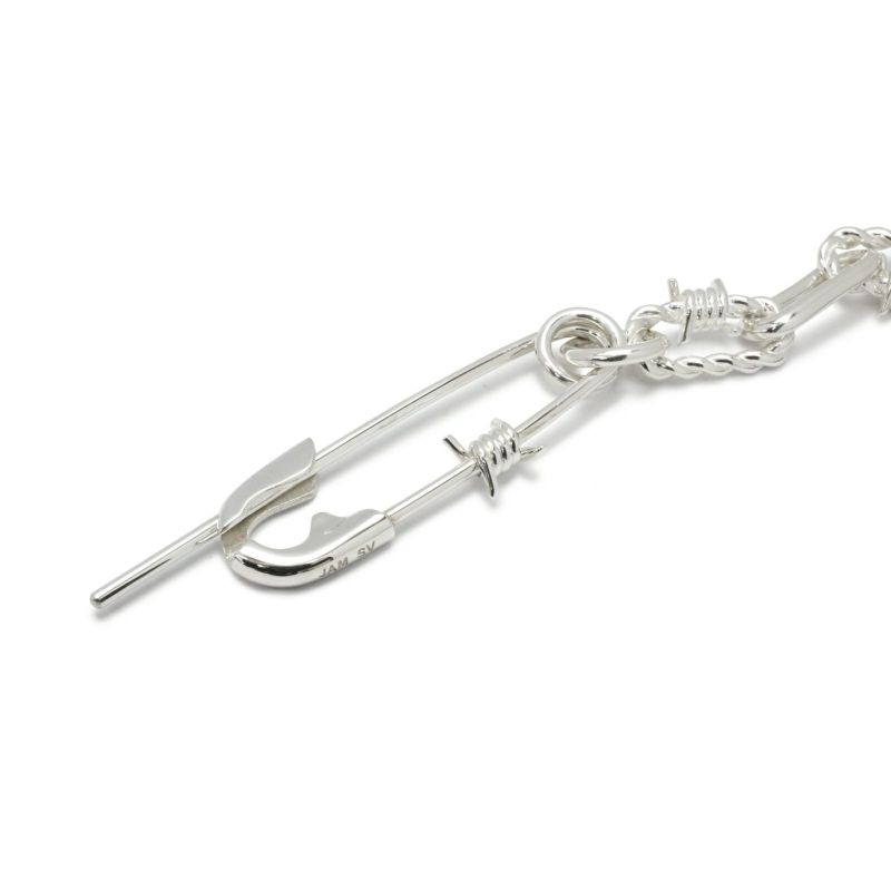 チェーンは、不法侵入や害獣対策に最適な有刺鉄線と通常の安全ピンブレスレットのチェーンを交互に使用し、他では見たことない唯一無二のブレスレットが誕生。