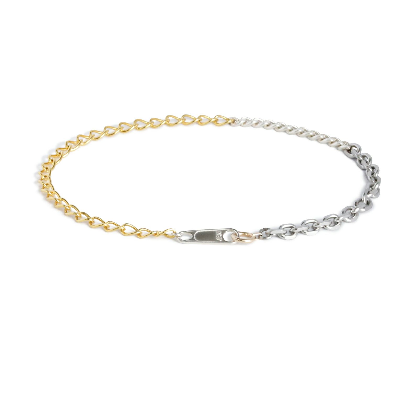 4つの素材(10K,SILVER925,SUS,BRASS)を用いて、ゴールドカラー/シルバーカラーのコンビネーションのチェーンブレスレットに仕上げました。