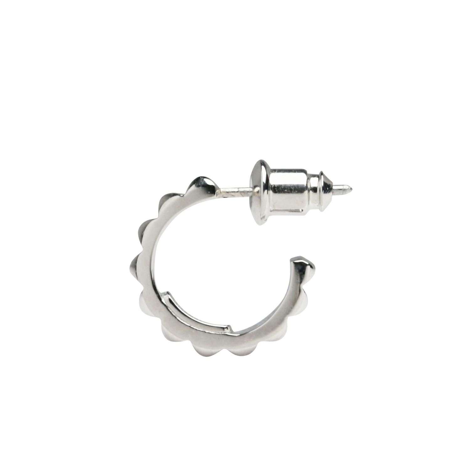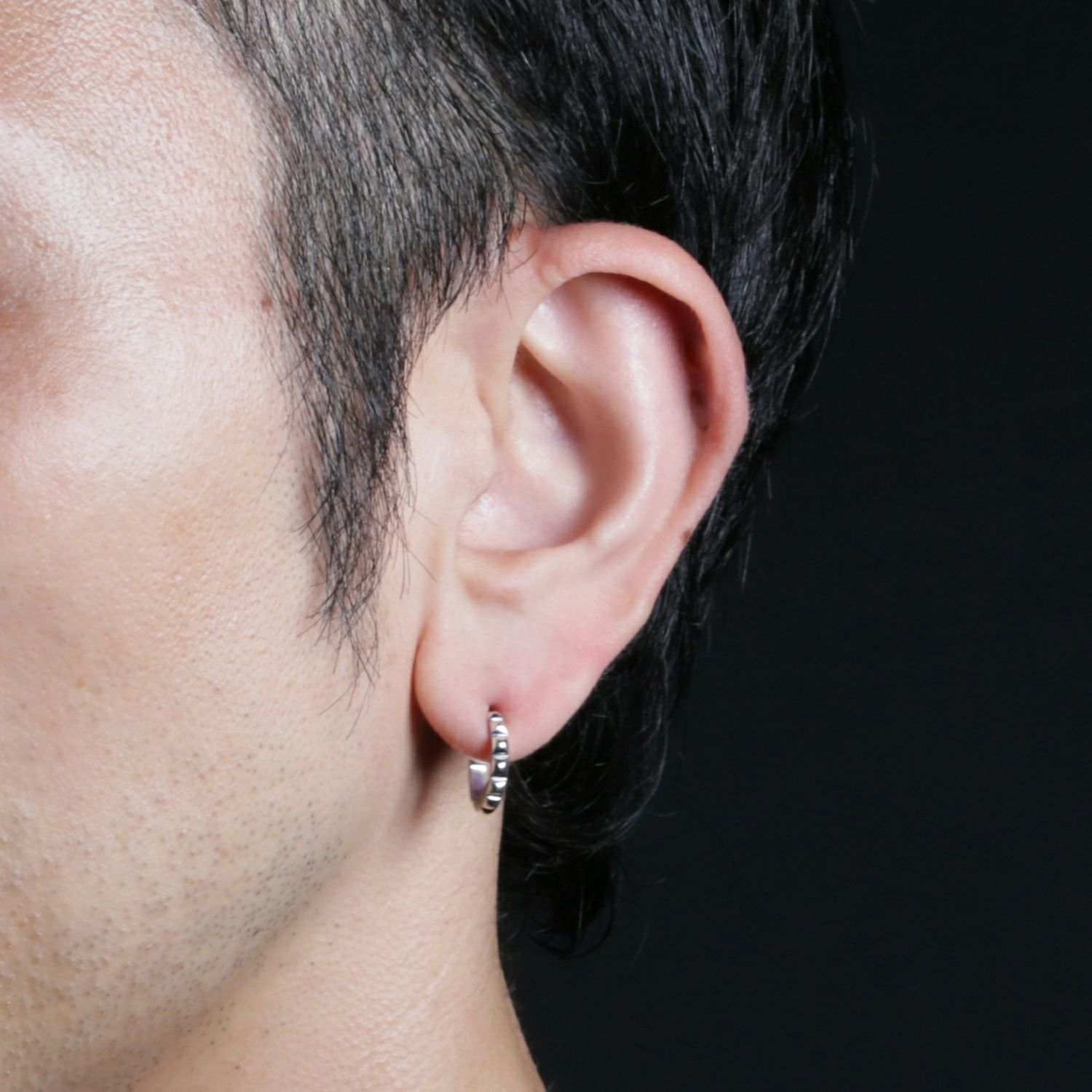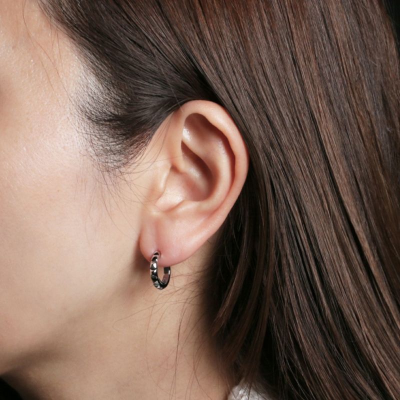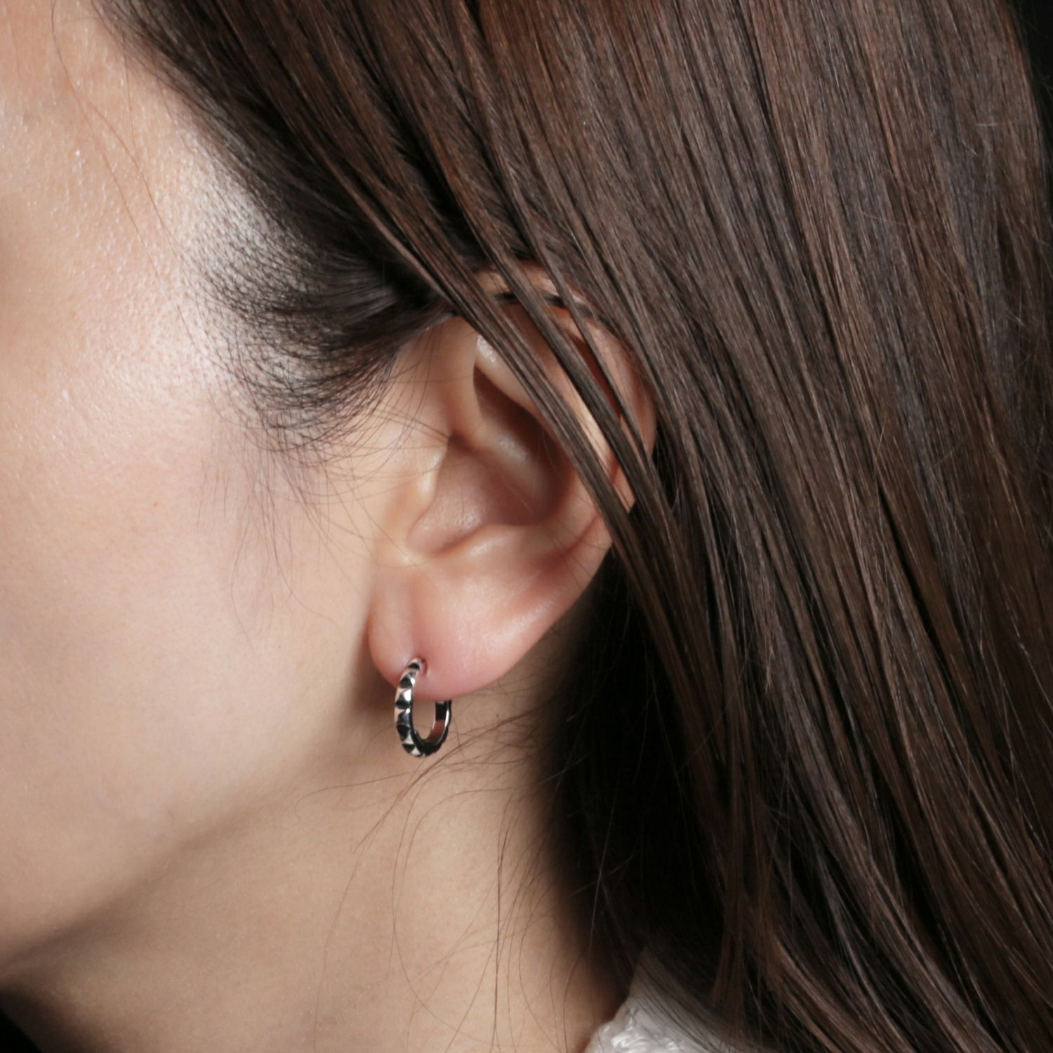 スタッズのエッジと、フープの曲線美。その相反する要素が絶妙にマッチ。男女問わずつけられるジェンダーレスデザイン。