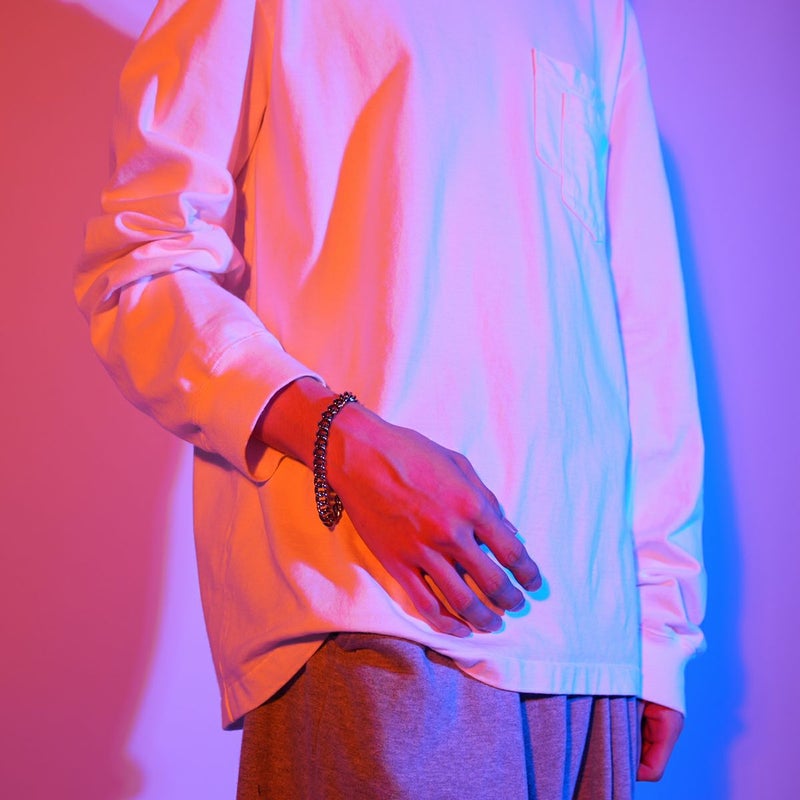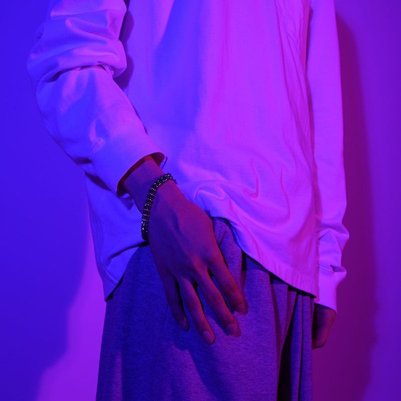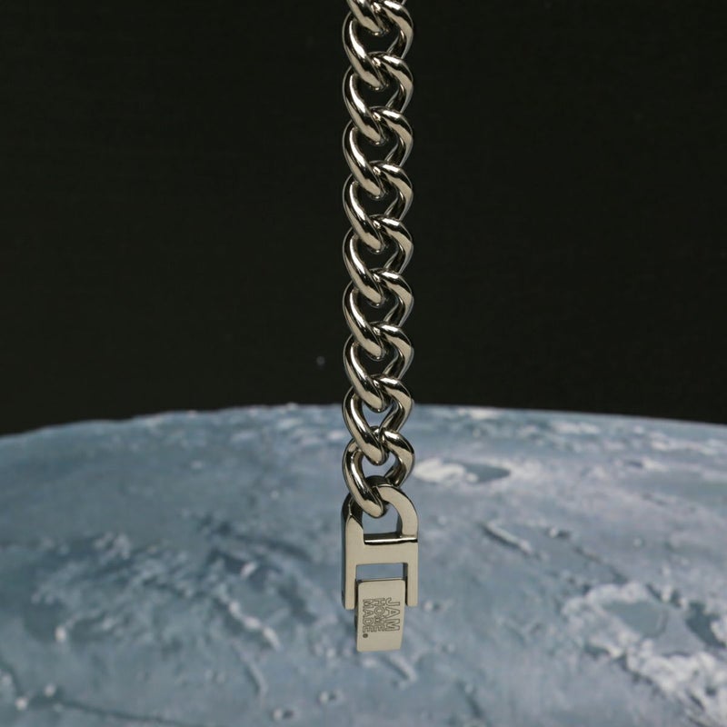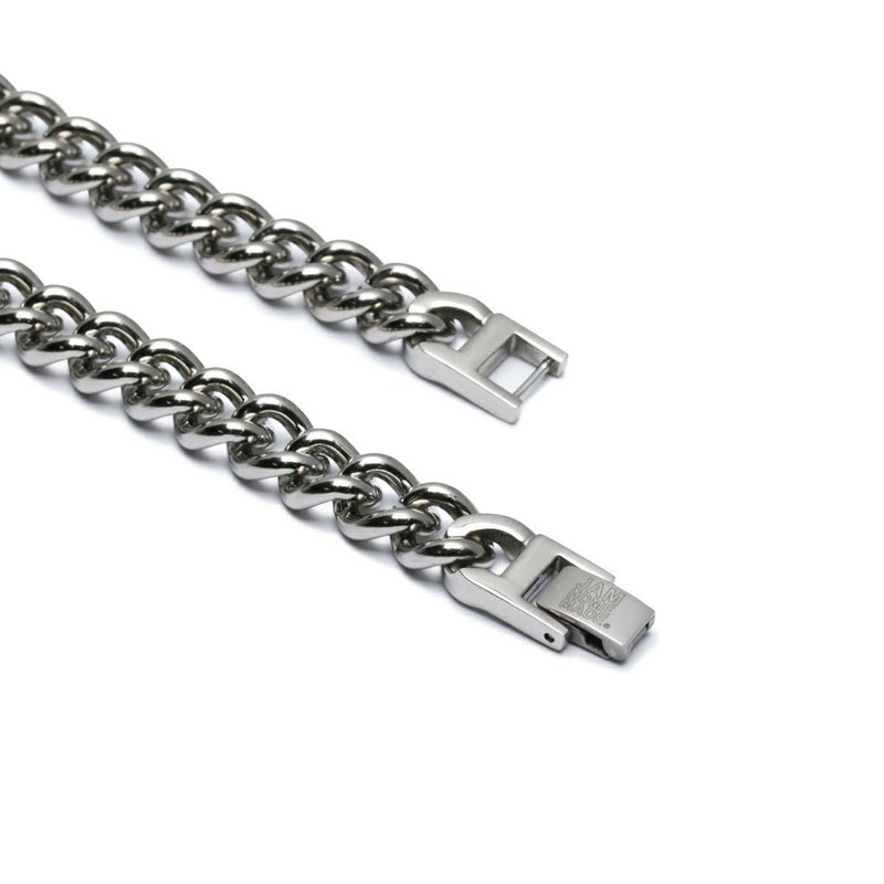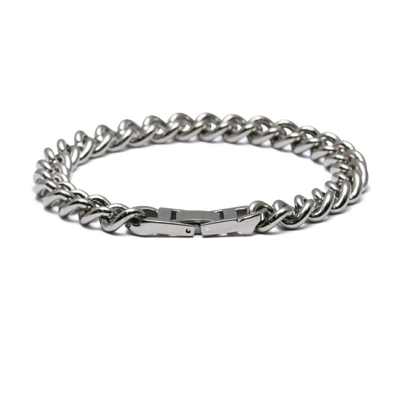 航空機やロケット、人工関節にまで使われる高機能性をそのままにデザインに落とし込んだチェーンブレスレット。