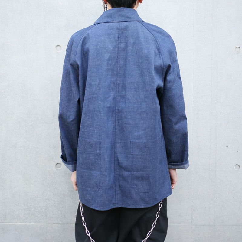 ボタンは、どちらを表に着てもストレスの無いように、取り外し式のとってもいいボタン。飾りの二重カンは、外してアクセサリーにも転化する。形状はカルフォルニア・ゴールドラッシュ初期のカバーオールをイメージしながら、フランス鉄道や、国鉄ナッパ服のレイルロードJKTのディテールを細部に落とし込んだ各国の労働着が混在するデザインです。
