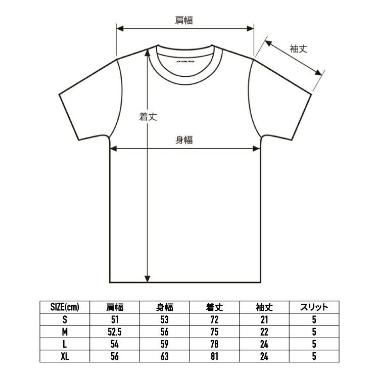 本コレクショングラフィックをポリエステルのシワになりにくさ、乾きやすさと、綿のぬくもりと通気性・吸水性の良さ、静電気の起こりにくさなど、いいとこ取りした万能な生地を使用したジャムホームメイドのオリジナルボディのど真ん中に大胆に配置したTシャツ。