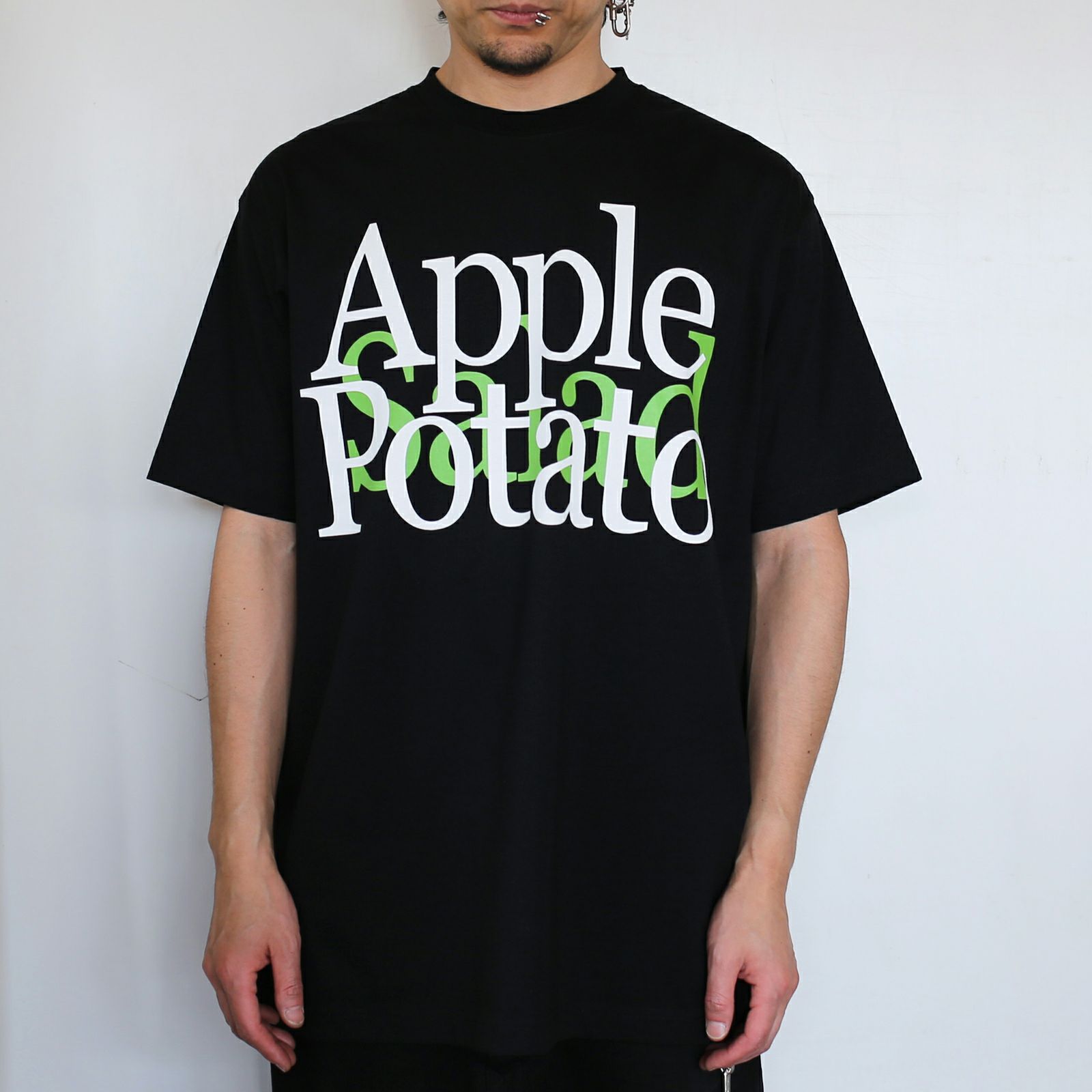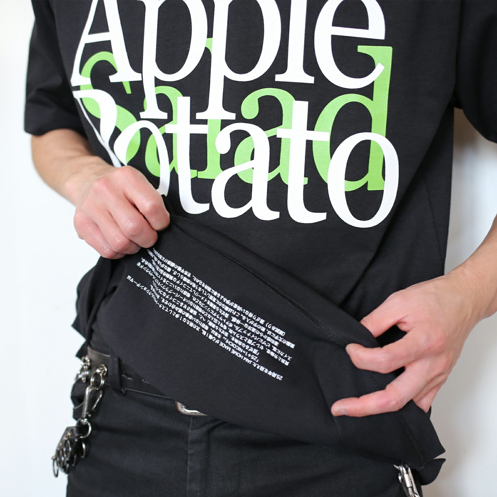 ポリエステルのシワになりにくさ、乾きやすさと、綿のぬくもりと通気性・吸水性の良さ、静電気の起こりにくさなど、いいとこ取りした万能な生地を使用したジャムホームメイドのオリジナルボディのオリジナルボディのTシャツに、Appleがロゴやブランディングに使用したフォントで「Apple/Potato/Salad」をプリント。