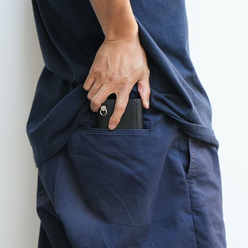 最低限サイズの小銭入れを背面に配置。お札やカードも専用のポケットでスムーズに収納可能。大きく開く札入れはお札の出し入れがしやすく、4つのカードポケットのうち、中央には名刺入れに使用して頂けるサイズのカードケースを配置しています。日常使いにぴったりな手に馴染むコンパクトな大きさでスマートな財布です。