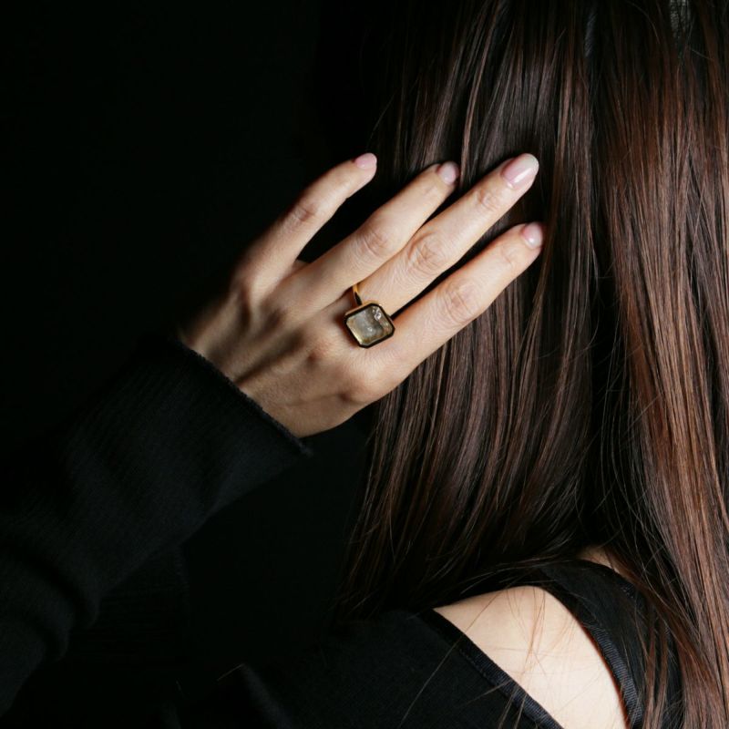天然ダイヤモンドを覆う透明無垢な氷に見たてたアクリル樹脂。台座はシルバー925製。13号から21号までのサイズ展開。