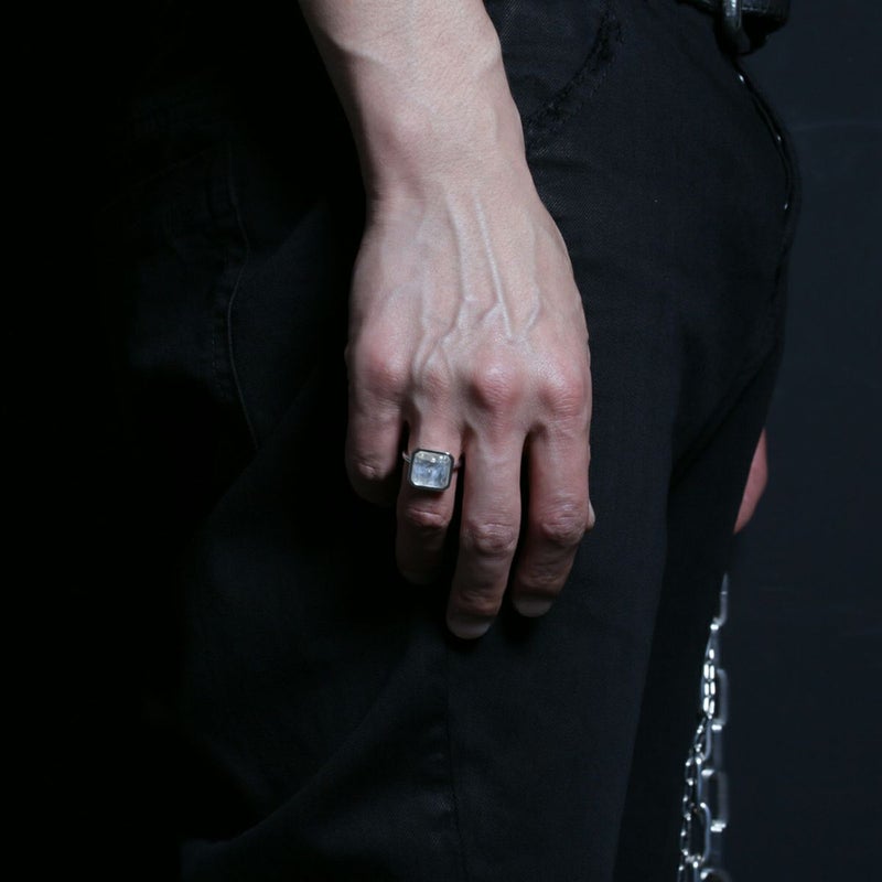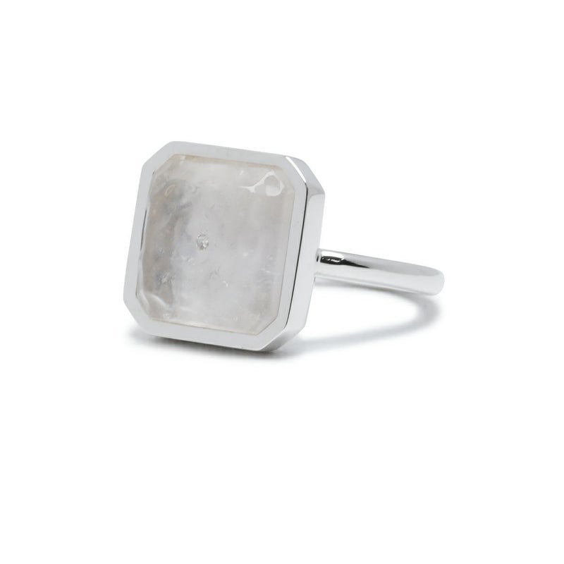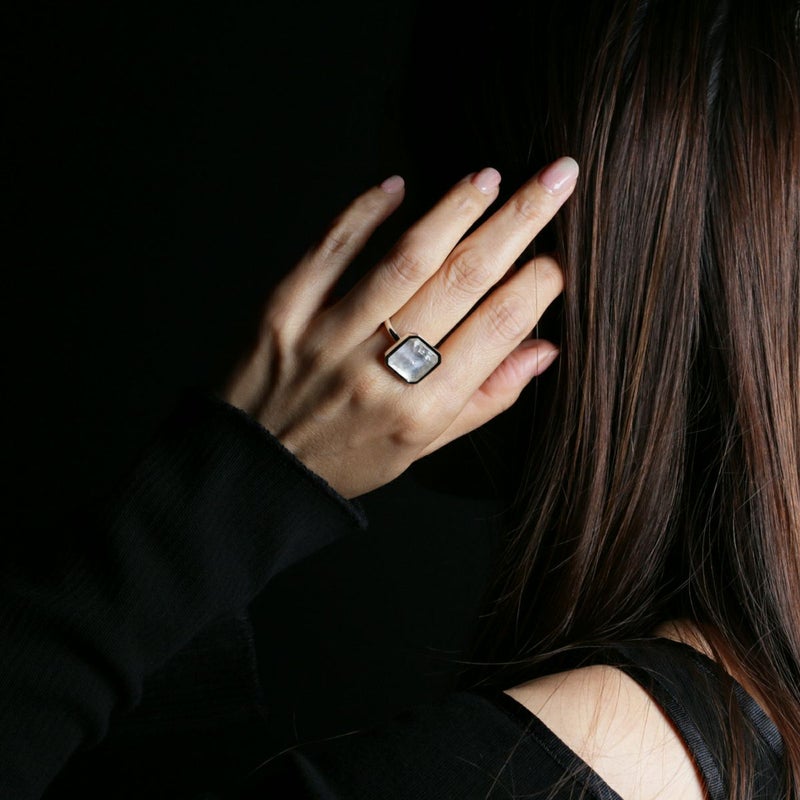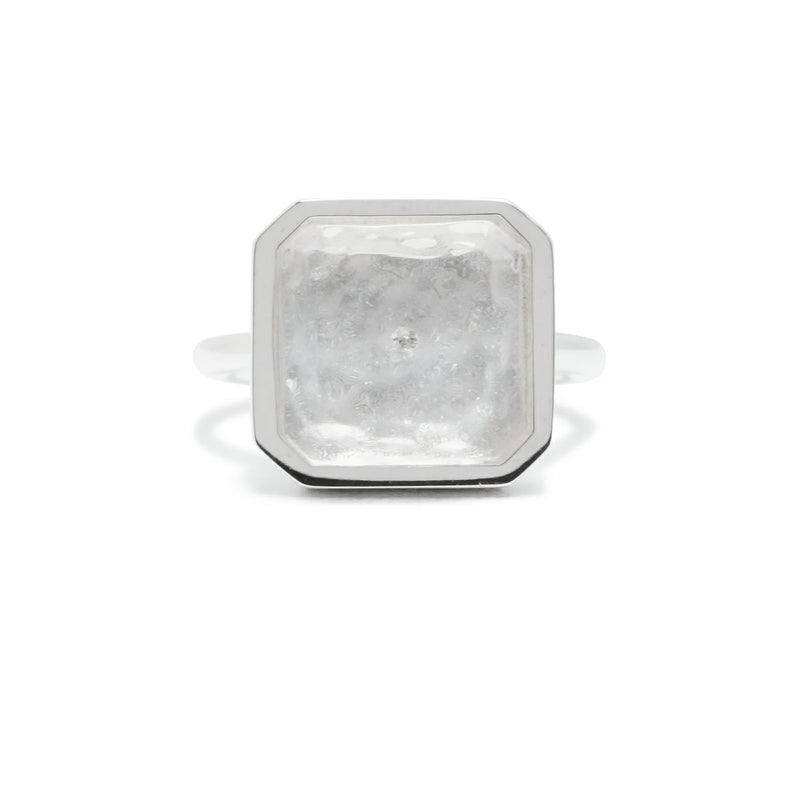 天然ダイヤモンドを覆う透明無垢な氷に見たてたアクリル樹脂。台座はシルバー925製。13号から21号までのサイズ展開。