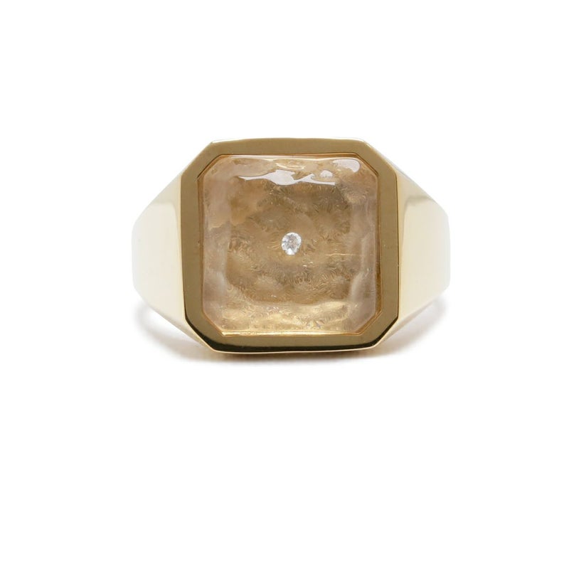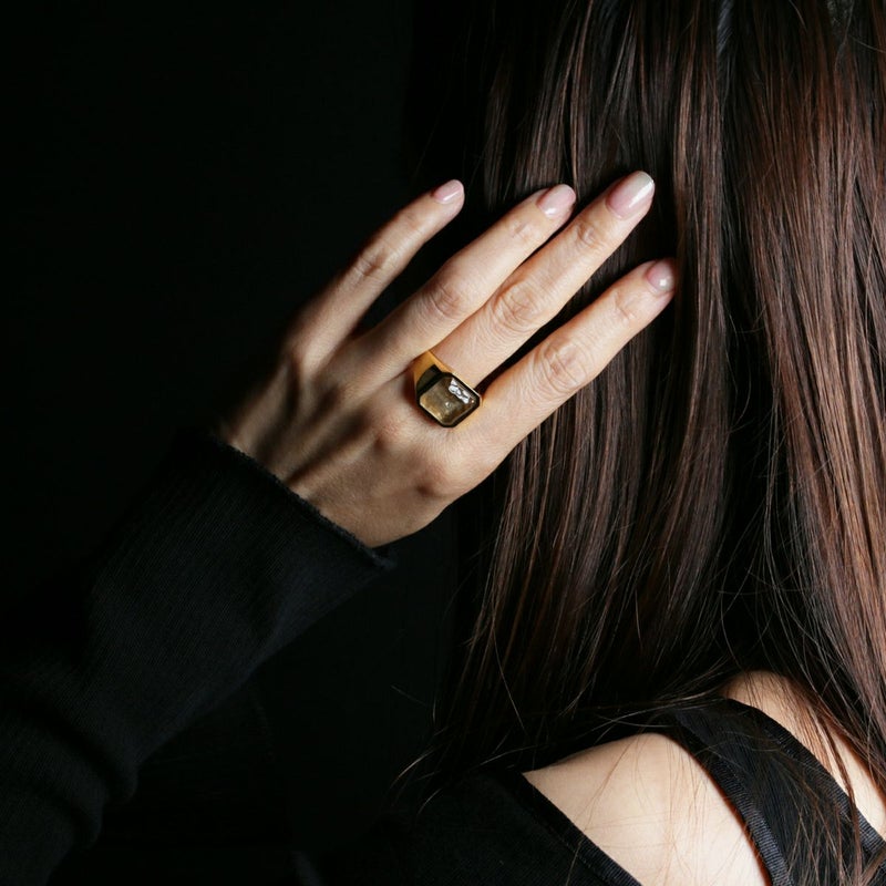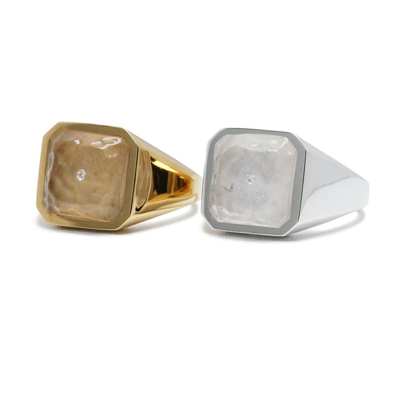 天然ダイヤモンドを覆う透明無垢な氷に見たてたアクリル樹脂。台座はシルバー925製。13号から21号までのサイズ展開。