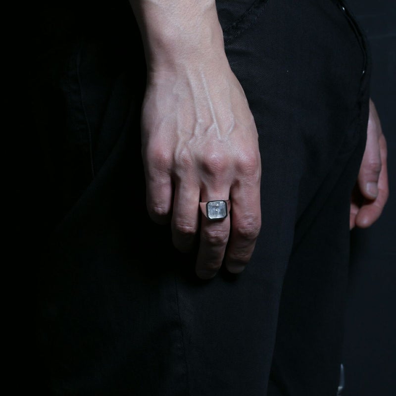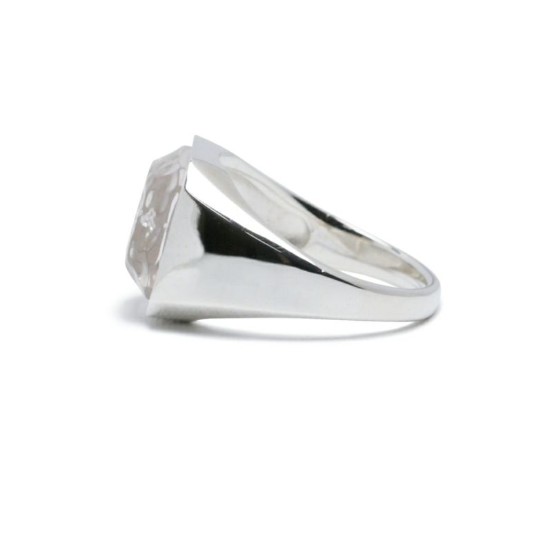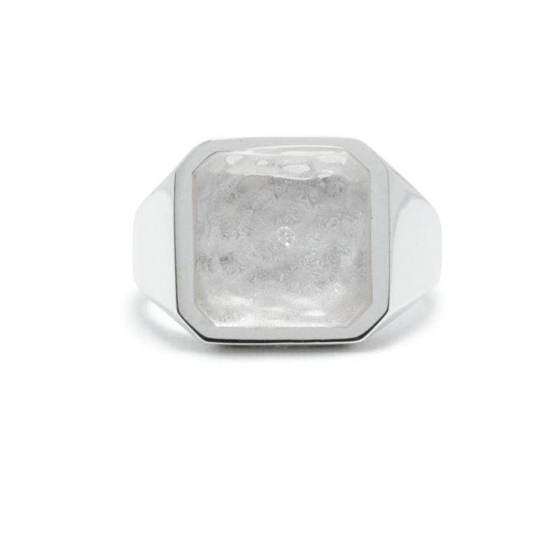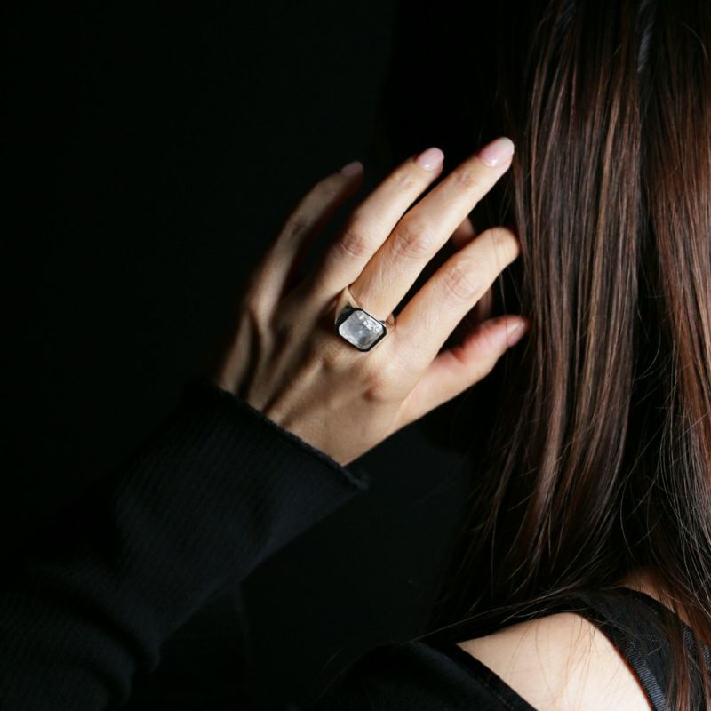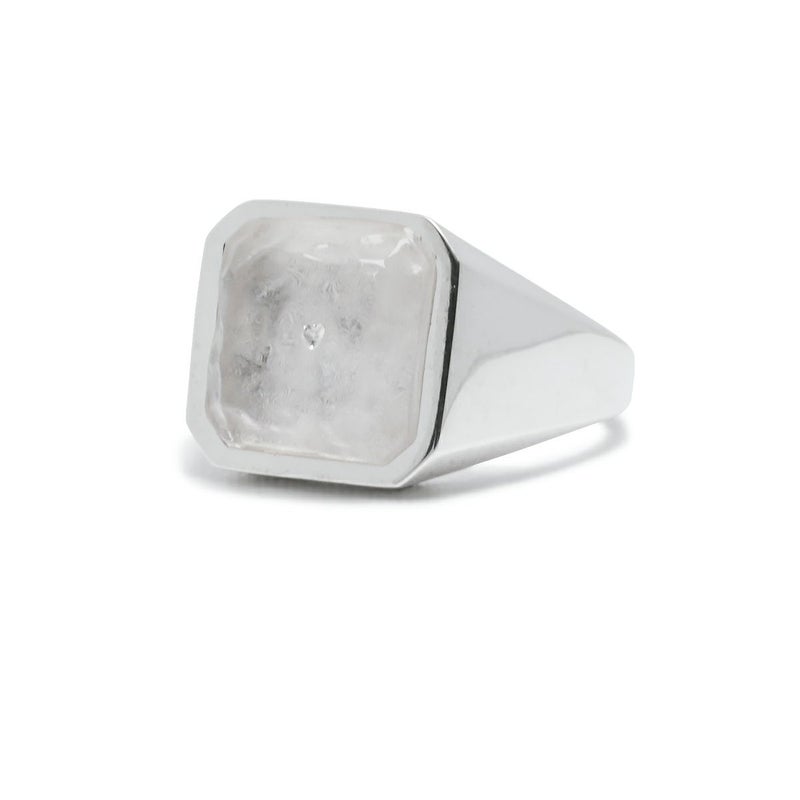 天然ダイヤモンドを覆う透明無垢な氷に見たてたアクリル樹脂。台座はシルバー925製。13号から21号までのサイズ展開。