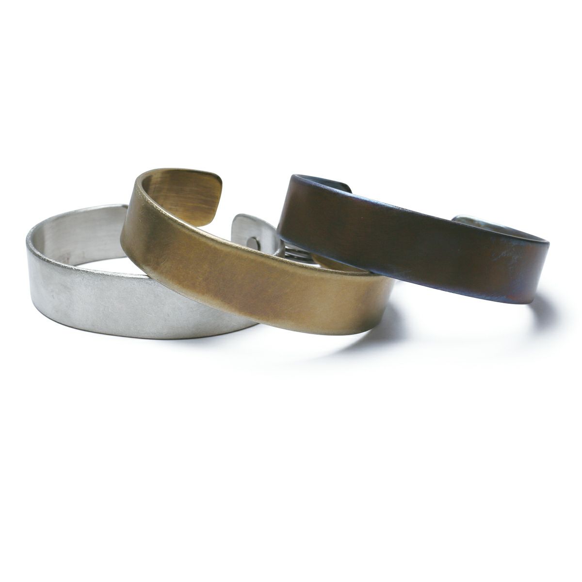シンプルでフラットでありながら重厚感のあるフォルムのバングルは手作業で作られ、マテリアルの素材感を生かしたインダストリアルな仕上がり。