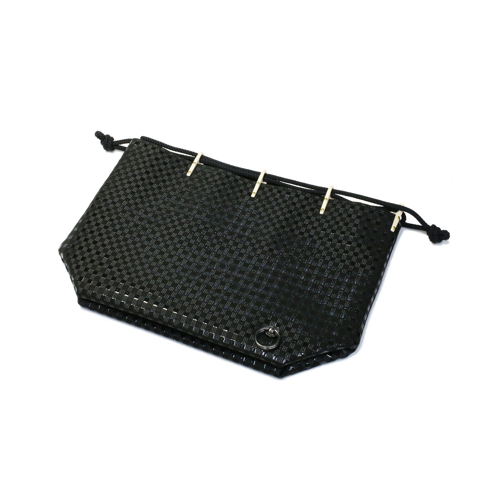 口にコキをつけて紐を通しており、マチ付きのため見た目以上にアイテムが収まります。