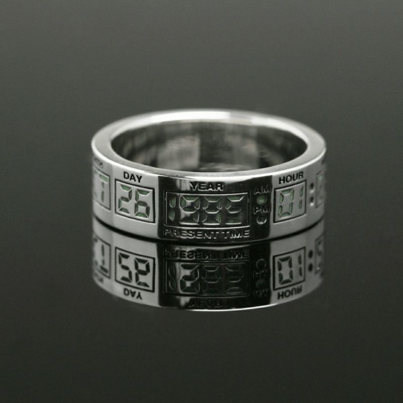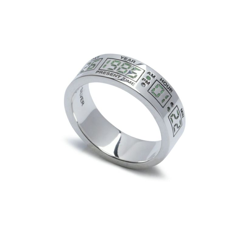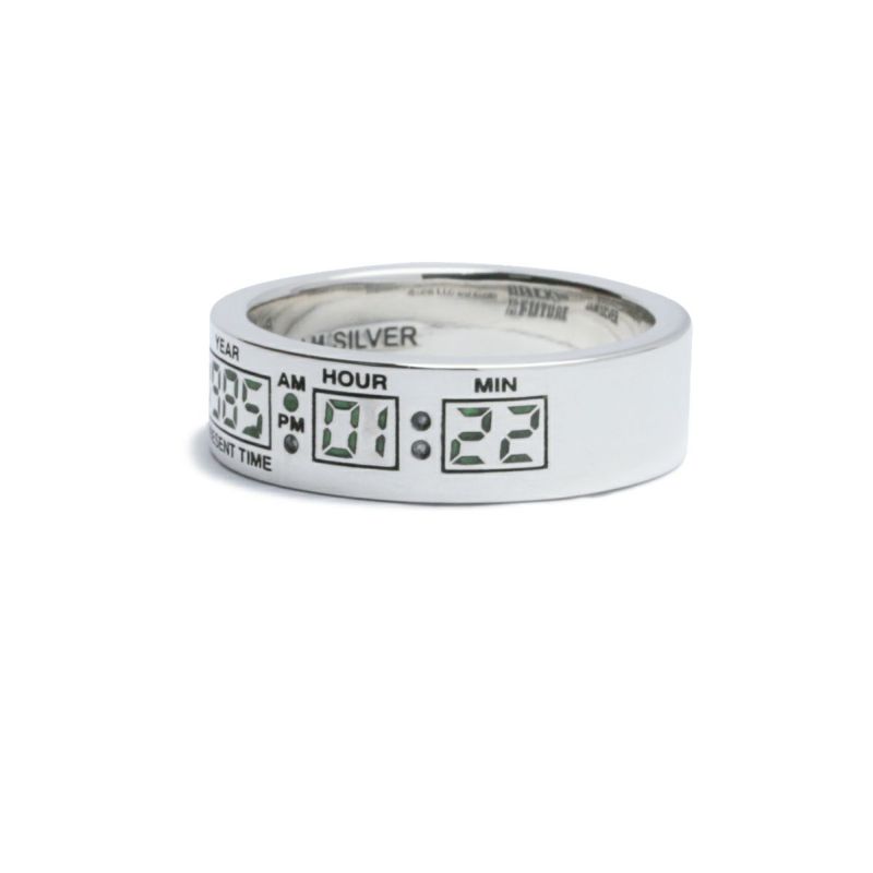 過去にも未来にも設定する必要がある、タイムマシンに備わる次元転移装置(タイムサーキット)をモチーフに作製したリングとブレスレットは、現在を示すデジタル印字を設定。蓄光塗料によって暗闇で淡く発光します。