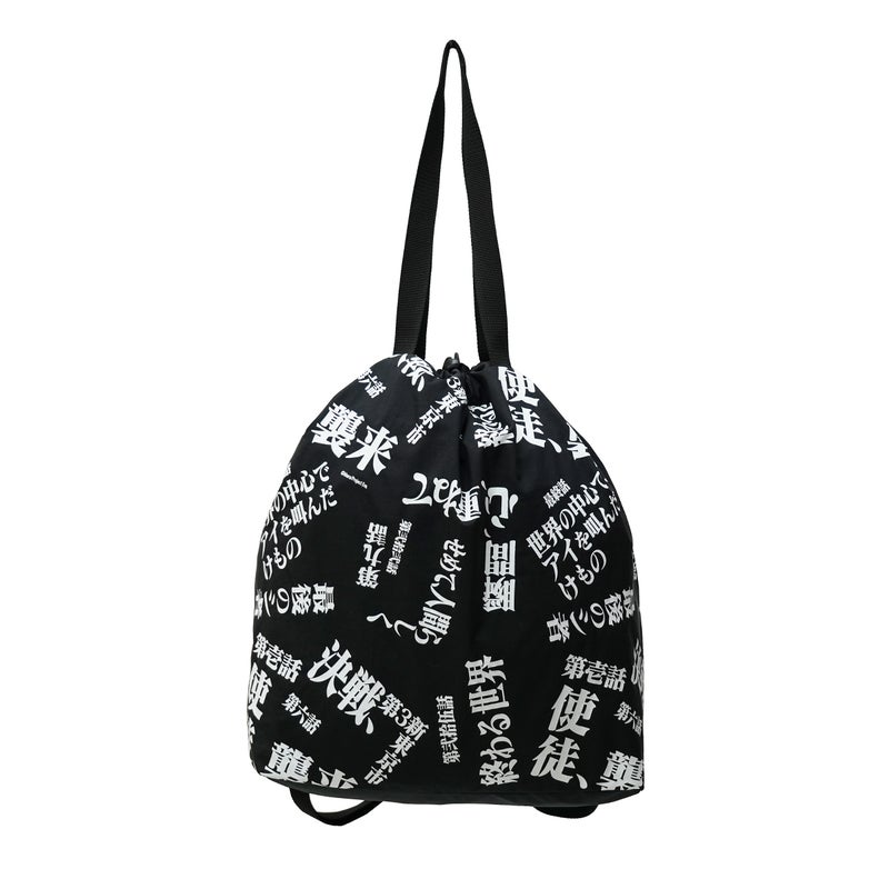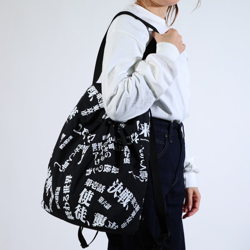 シンプルでスタイリッシュなトートバック/ナップパックに、サブタイトルの文字を散りばめたCAMO柄を大胆にプリント。