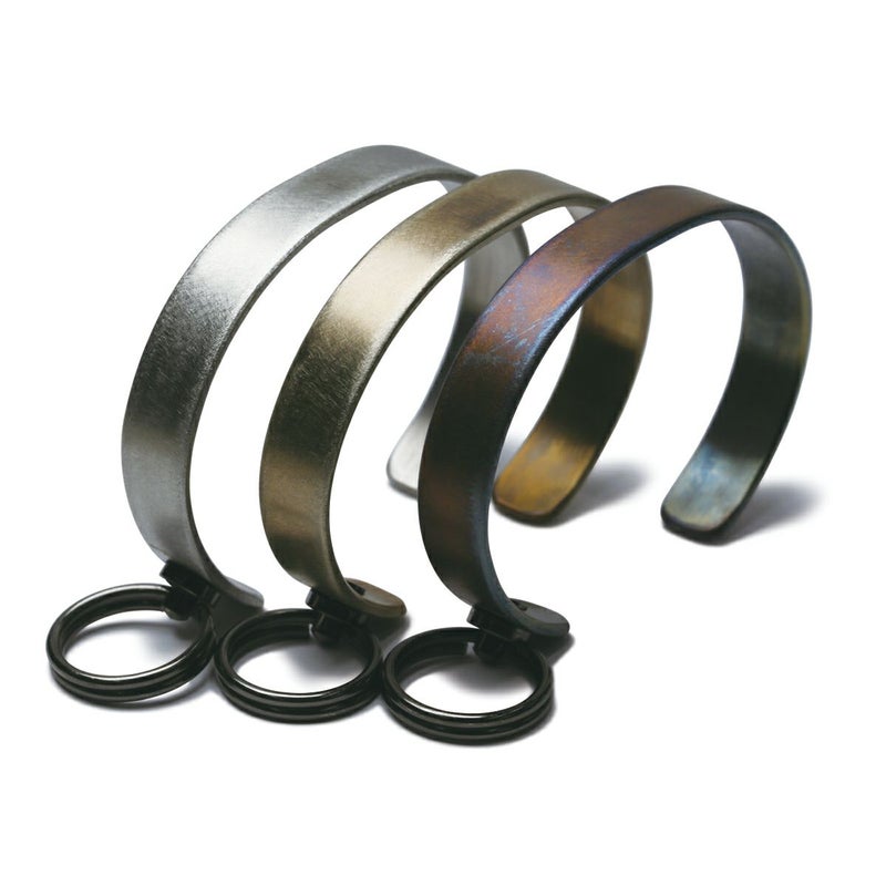 シンプルでフラットでありながら重厚感のあるフォルムのバングルは手作業で作られ、マテリアルの素材感を生かしたインダストリアルな仕上がり。
