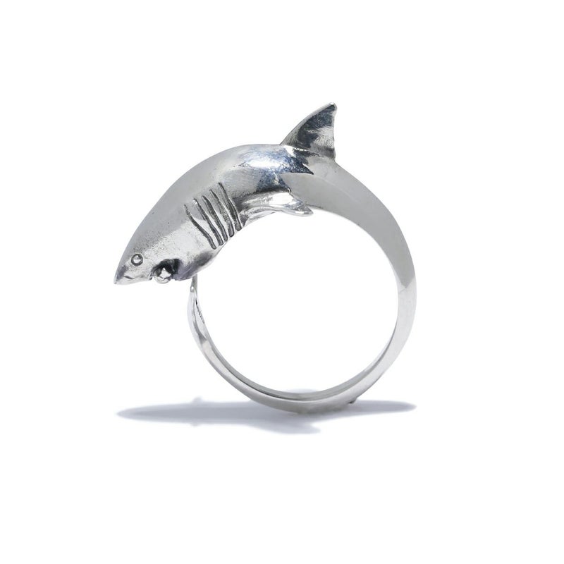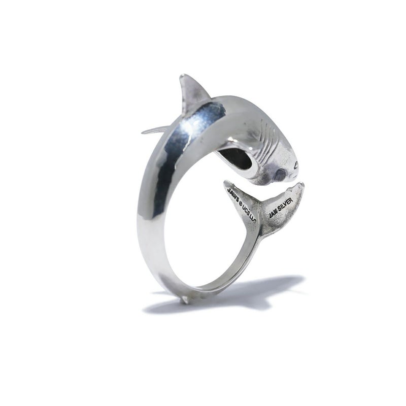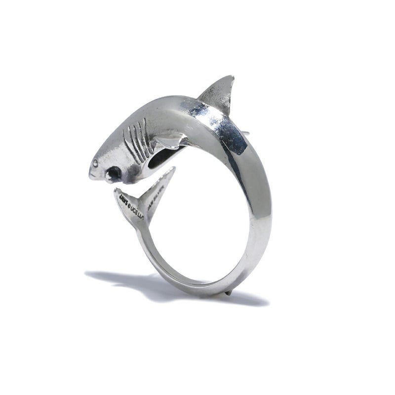 『ジョーズ』のサメを立体的に表現したリングは、躍動感を表現するためにエッジかつ、全体を奇麗な曲線でまとめました。フリーサイズ風の仕様となっていますので、付け心地は良好。サイズ展開豊富ですので、プレゼントやギフトにも最適なアイテムです。使い込むごとにボディのシルバーの良さでもある経年変化を楽しむことができます。