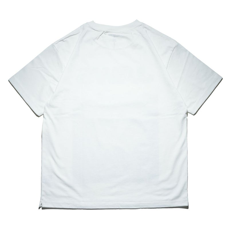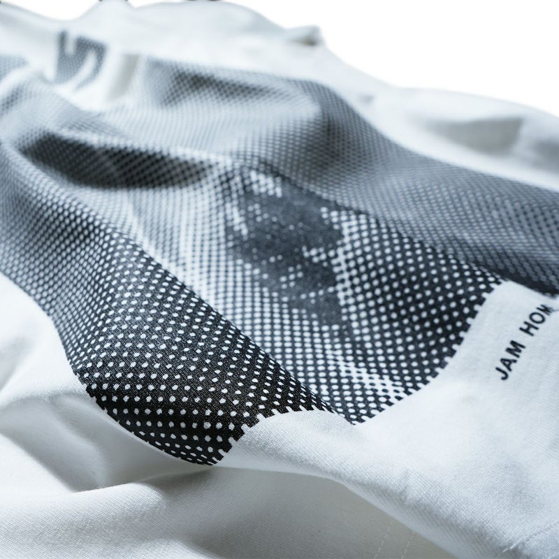 モノクロームプリントしクラック加工したグラフィックで、ボディは着心地にもこだわり、ポリエステルのシワになりにくさ、乾きやすさと、綿のぬくもりと通気性・吸水性の良さ、静電気の起こりにくさなど、いいとこ取りした万能生地を使用したジャムホームメイドのオリジナルボディ。程よくゆとりを持たせたシルエットで、気負わずラフに着用して頂けるひと品。