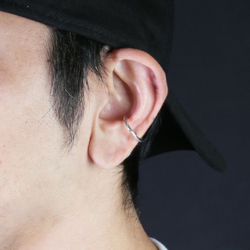 シルバー(鏡面仕上)、シルバー(燻鏡面仕上)、ガンメタルカラー、ピンクゴールド、イエローゴールドの4色展開でユニセックスにご使用頂ける片耳タイプのフープピアスです。
