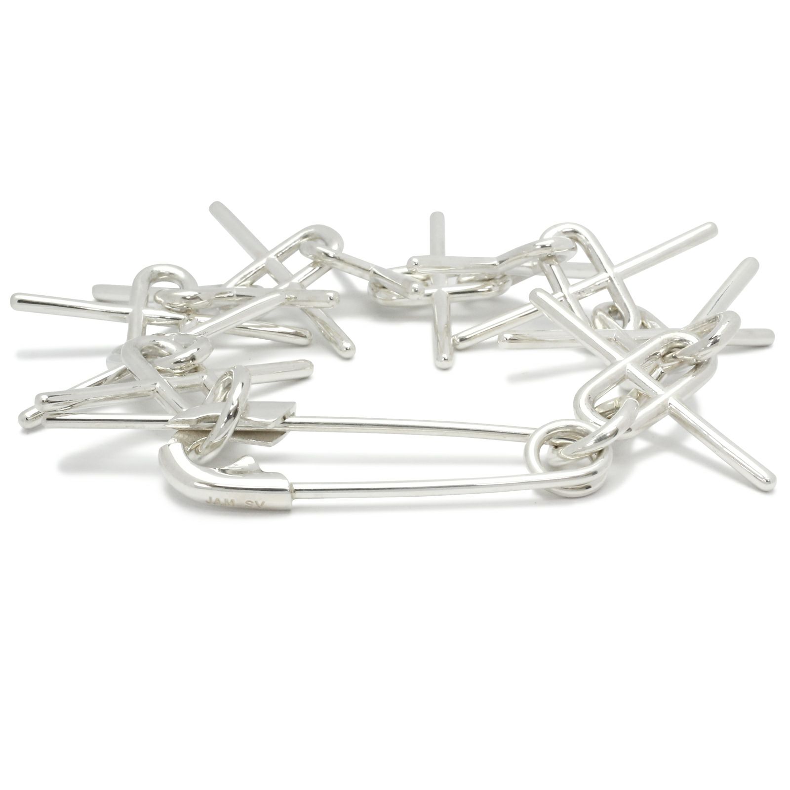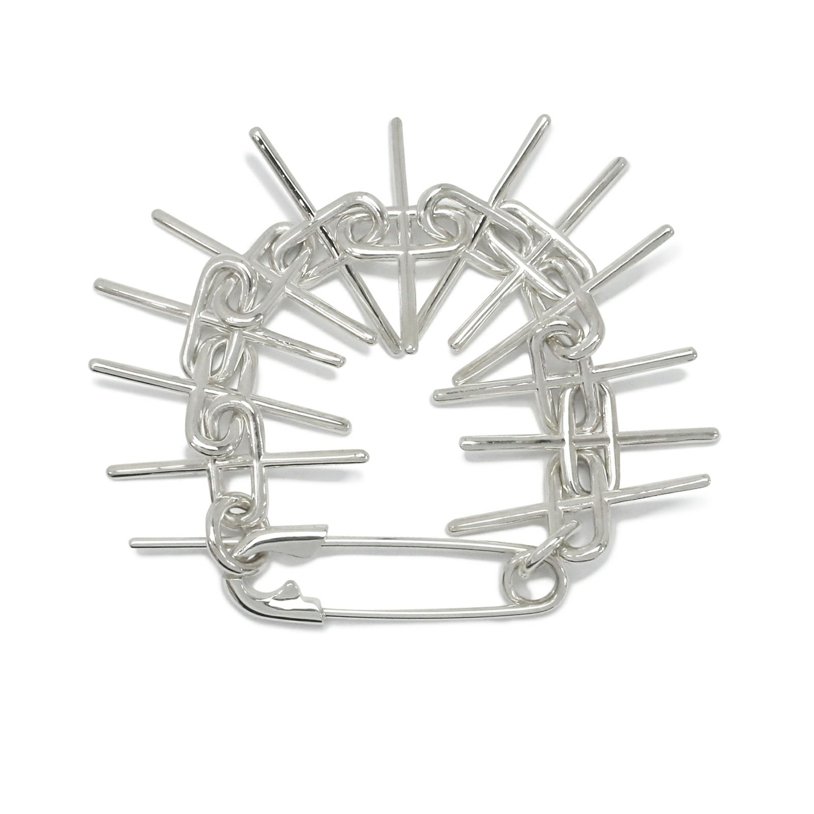 安全を冠にしながら逆のイメージが先行する安全ピンの矛盾を紐解くべく、正しく正そうと反逆を正逆にしました。安全じゃない危険ピンのブレスレット。