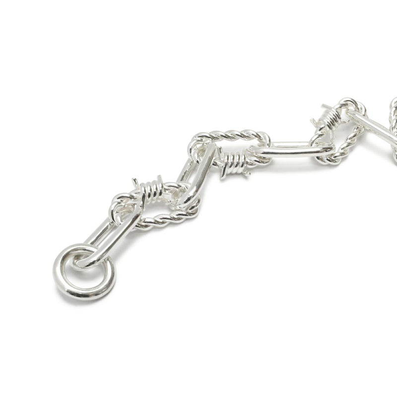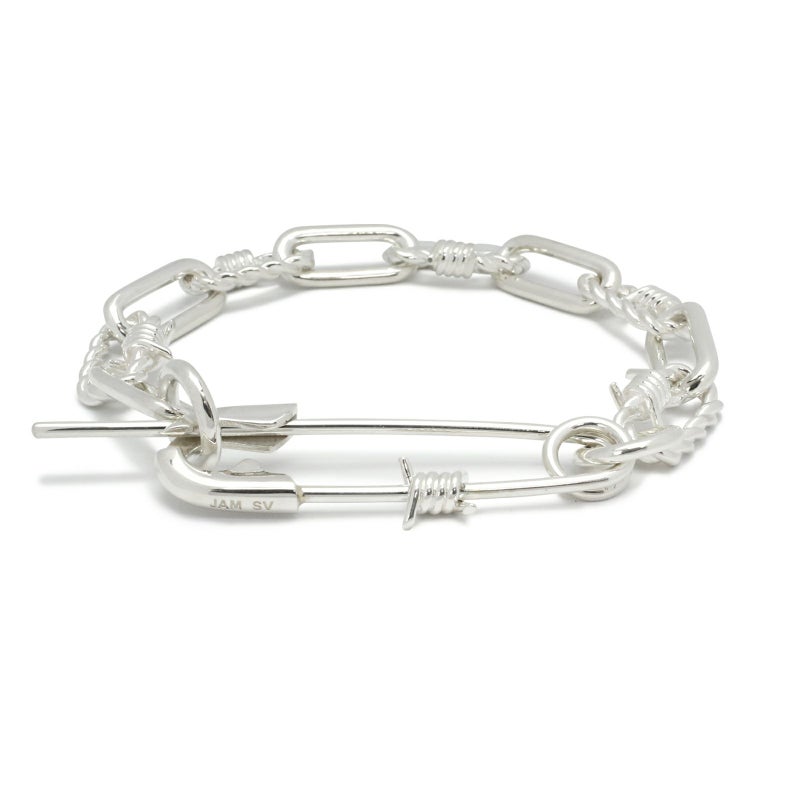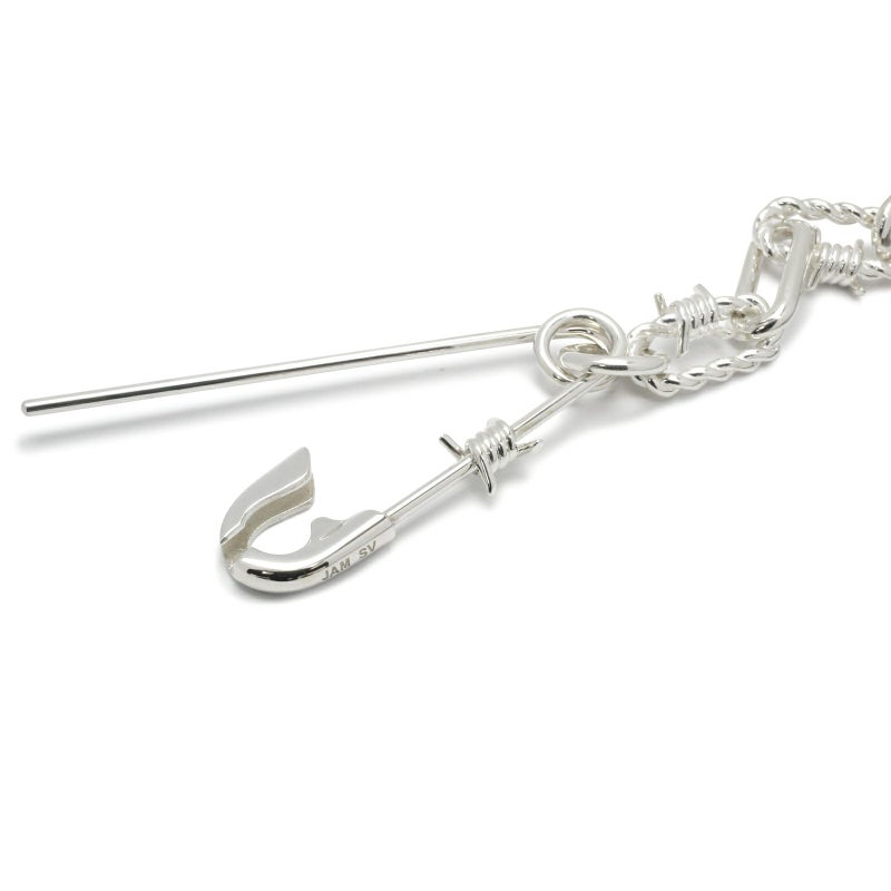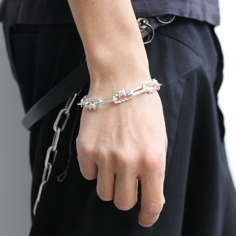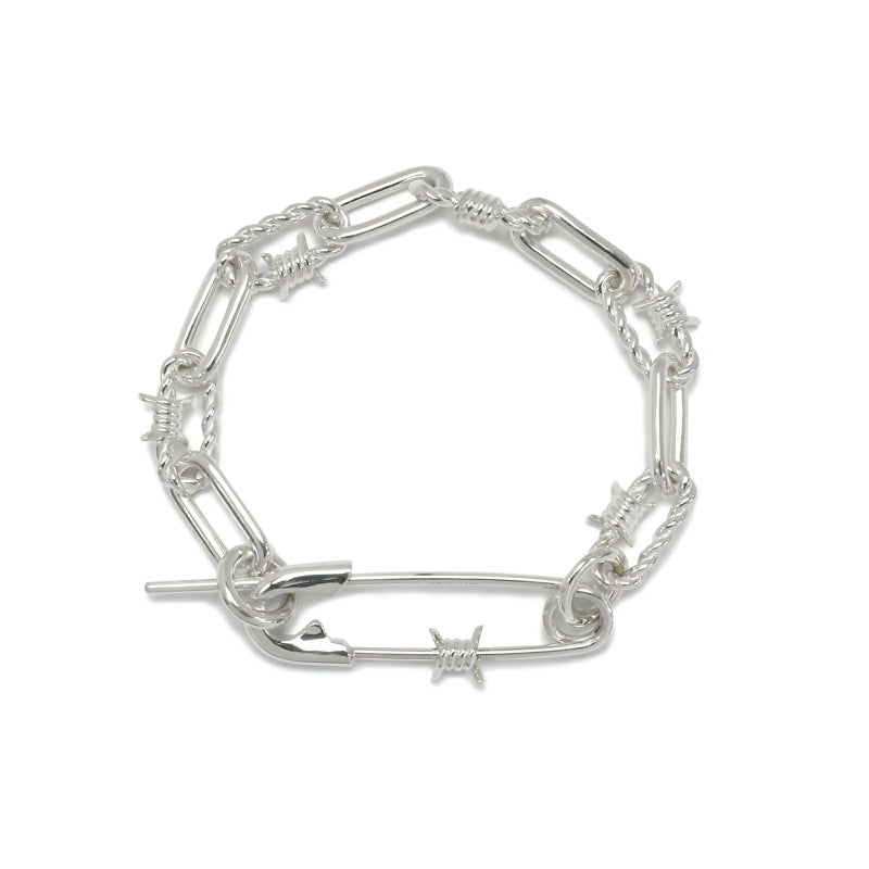 チェーンは、不法侵入や害獣対策に最適な有刺鉄線と通常の安全ピンブレスレットのチェーンを交互に使用し、他では見たことない唯一無二のブレスレットが誕生。