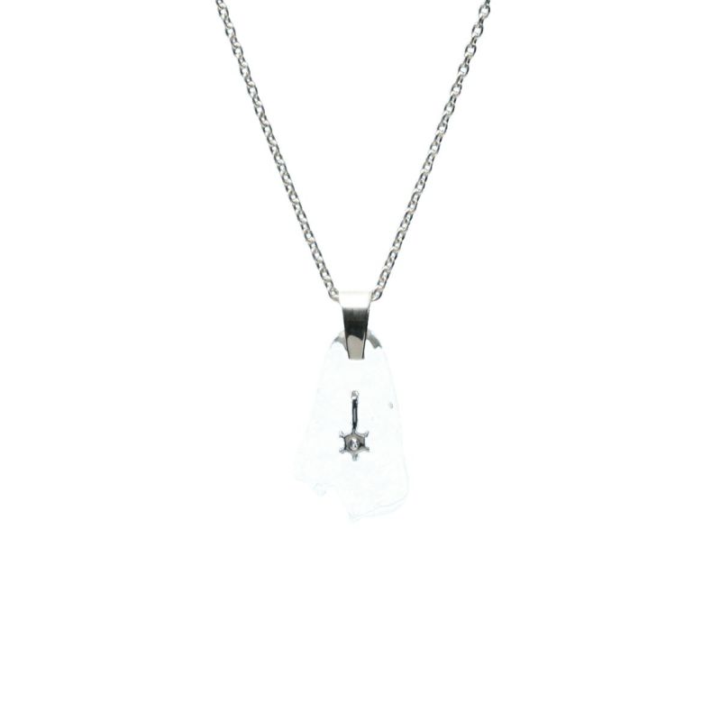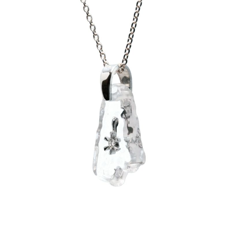祈りを込めて、氷をイメージした中にシャトンダイヤモンドを封じ込めました。氷を融かすのは、地球温暖化による気温上昇ではなく、相手を思う温かな心であってほしいと願う、パラドックスなフリーズプロダクト。