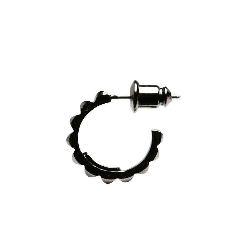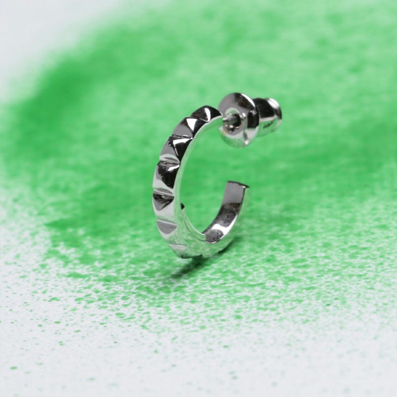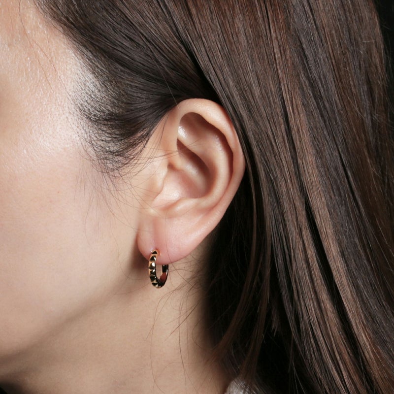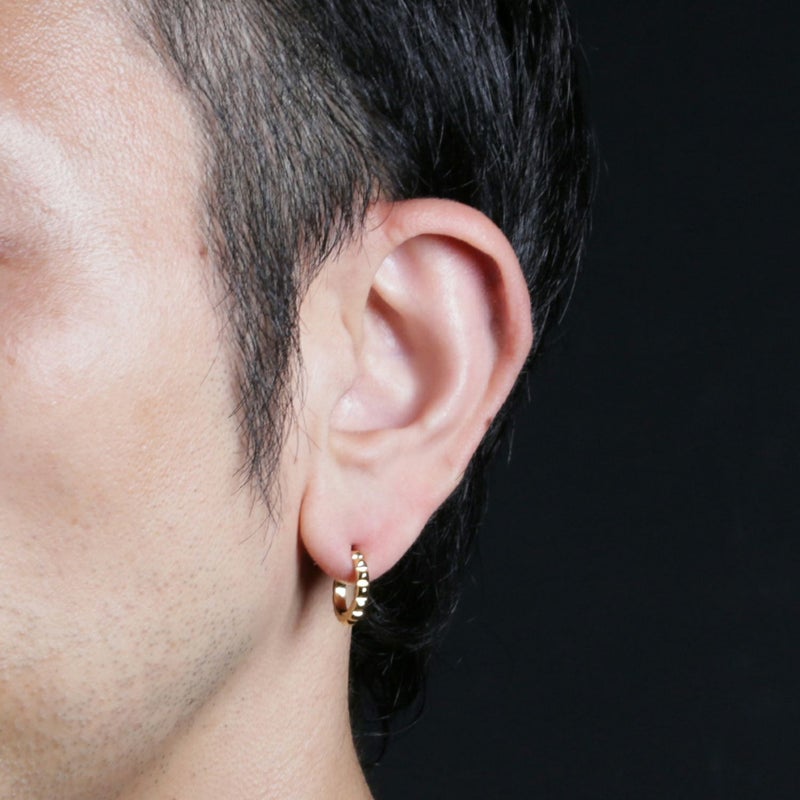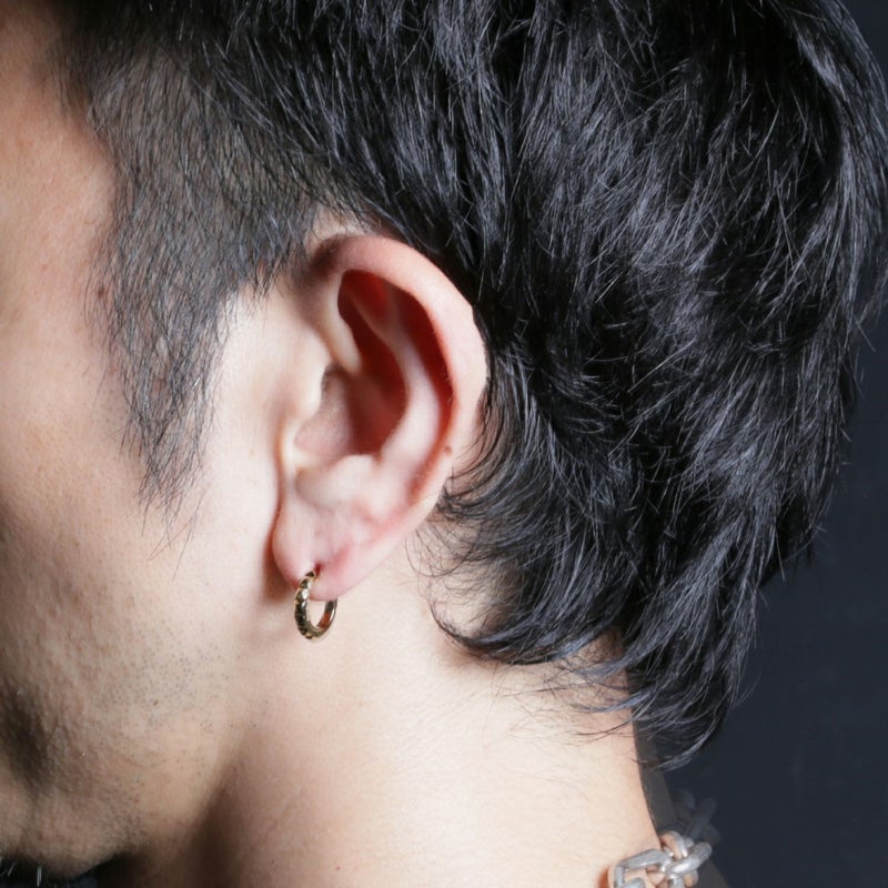 スタッズのエッジと、フープの曲線美。その相反する要素が絶妙にマッチ。男女問わずつけられるジェンダーレスデザイン。