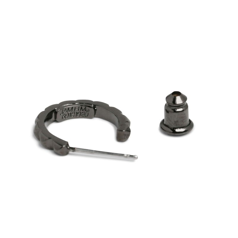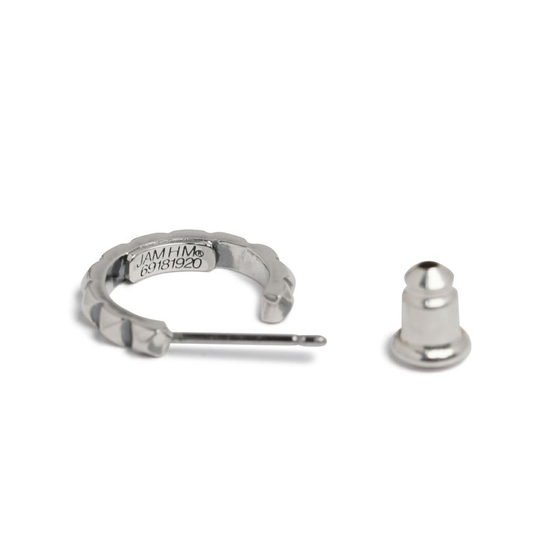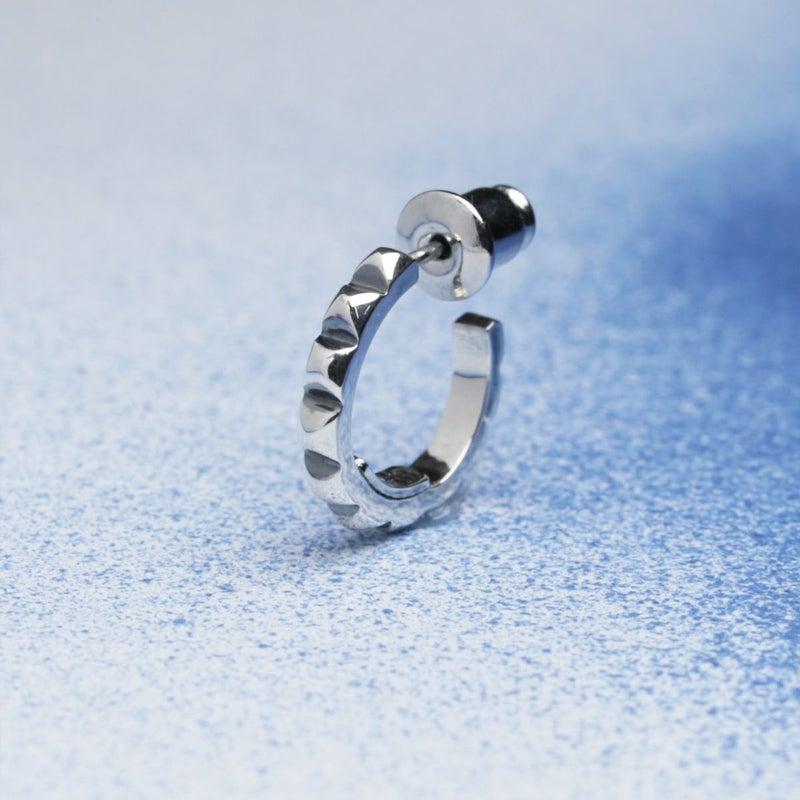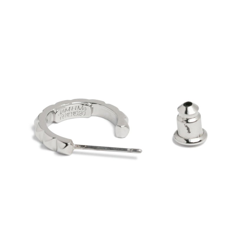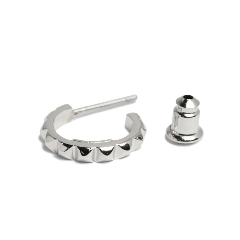 スタッズのエッジと、フープの曲線美。その相反する要素が絶妙にマッチ。男女問わずつけられるジェンダーレスデザイン。