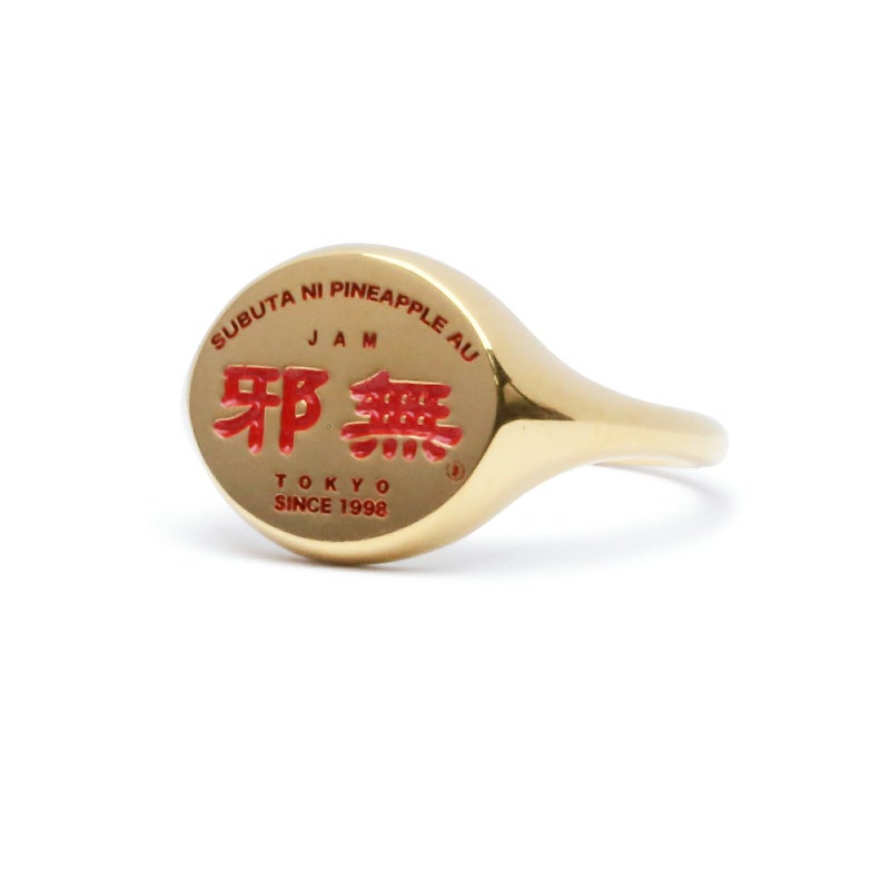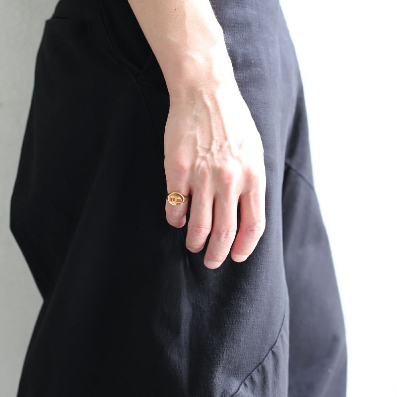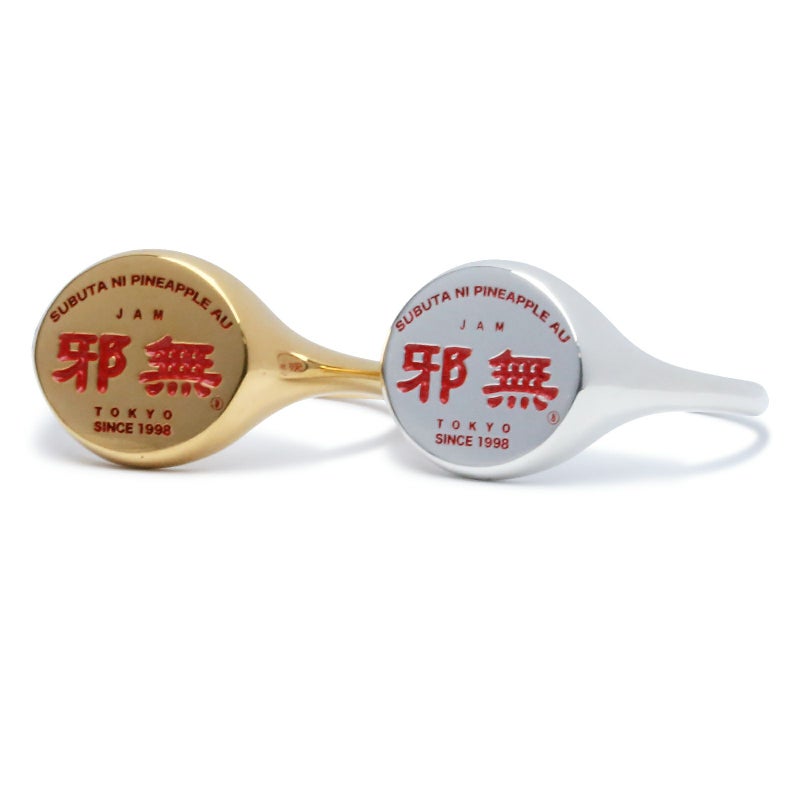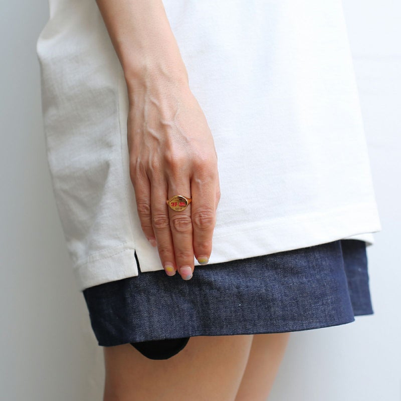 創業20年以上。ほぼすべての定食が1,000円弱というリーズナブルな価格、ボリュームはたっぷり。そしてオーダーから出てくるまでがとてもスピーディ。働く人、遊ぶ人の胃袋を満たし続けてきた、いわゆる町中華というジャンルに属す『 邪無 』という架空の街中華屋さんのスタッフTシャツ。そのロゴを印台デザインに採用したリング。