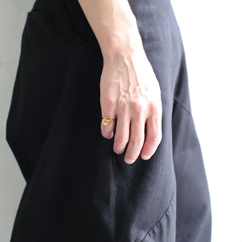 創業20年以上。ほぼすべての定食が1,000円弱というリーズナブルな価格、ボリュームはたっぷり。そしてオーダーから出てくるまでがとてもスピーディ。働く人、遊ぶ人の胃袋を満たし続けてきた、いわゆる町中華というジャンルに属す『 邪無 』という架空の街中華屋さんのスタッフTシャツ。そのロゴを印台デザインに採用したリング。