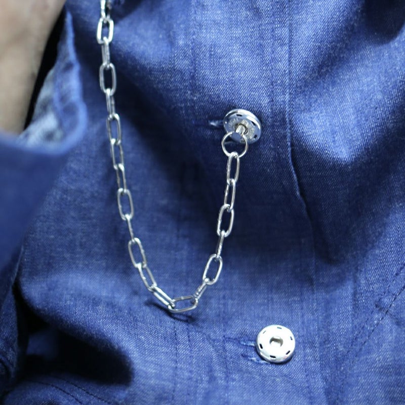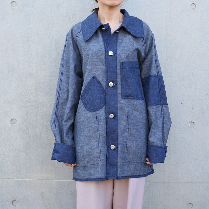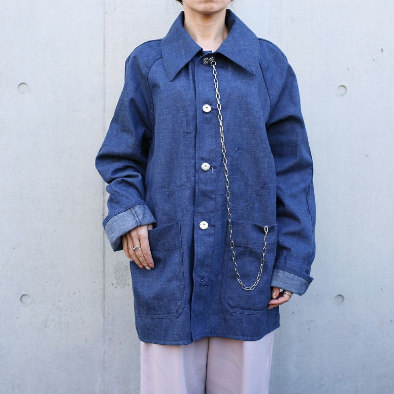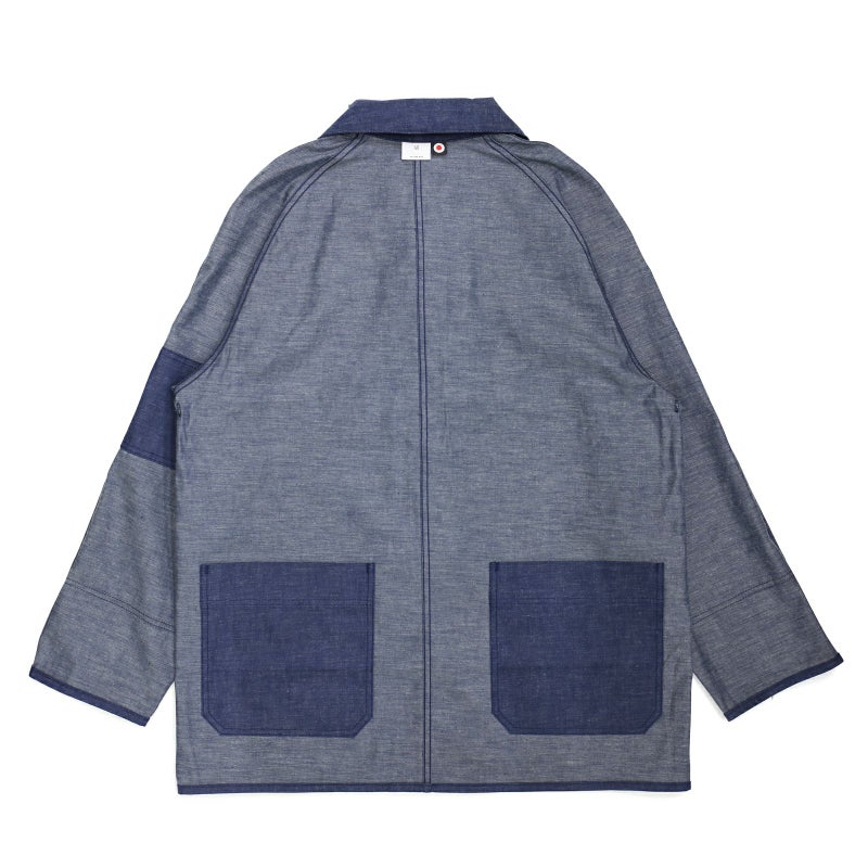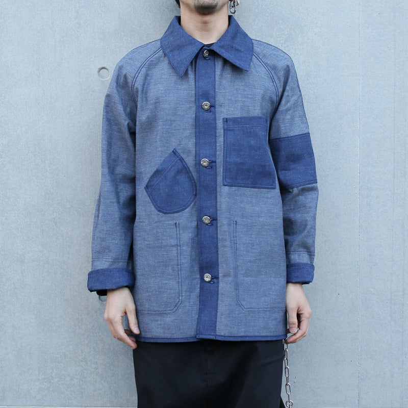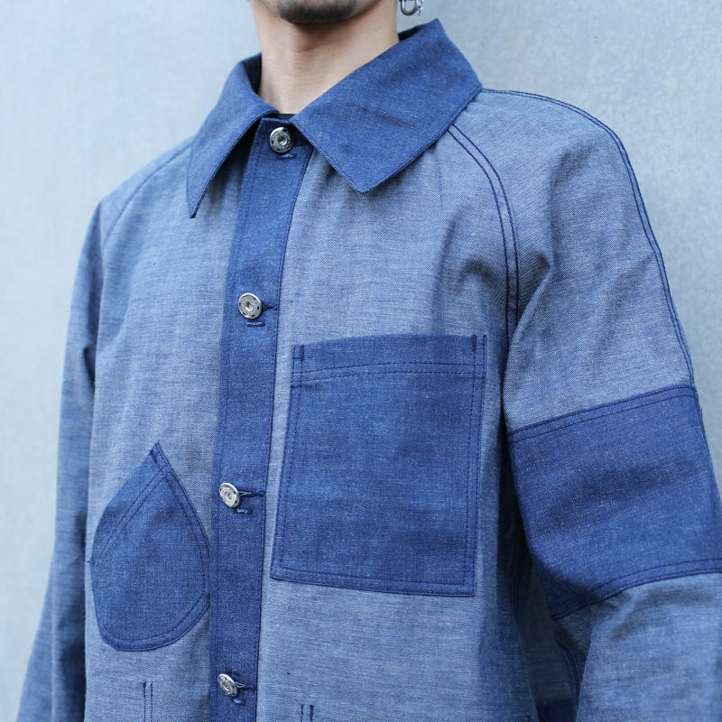 ボタンは、どちらを表に着てもストレスの無いように、取り外し式のとってもいいボタン。飾りの二重カンは、外してアクセサリーにも転化する。形状はカルフォルニア・ゴールドラッシュ初期のカバーオールをイメージしながら、フランス鉄道や、国鉄ナッパ服のレイルロードJKTのディテールを細部に落とし込んだ各国の労働着が混在するデザインです。