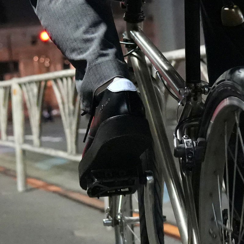 随所に配したシルバーパーツ、リフレクター。それは単なる装飾ではなく、「未来を照らすための光」のイメージ。ドレスとカジュアル、伝統と革新、静と動をミックスし、自転車でNYの街を駆け抜けても様になる一足に仕上げました。