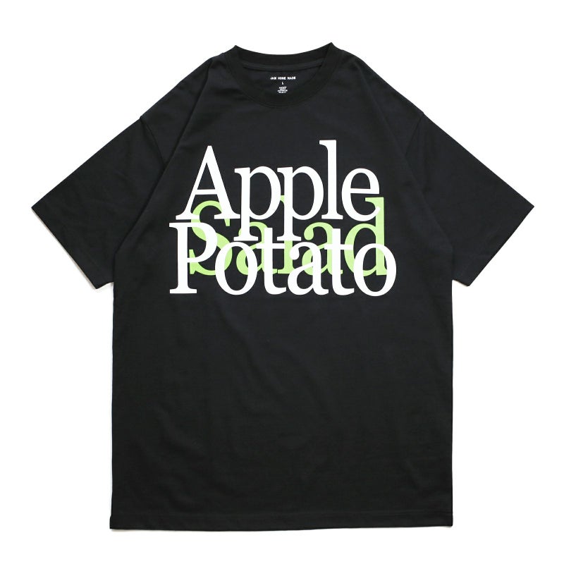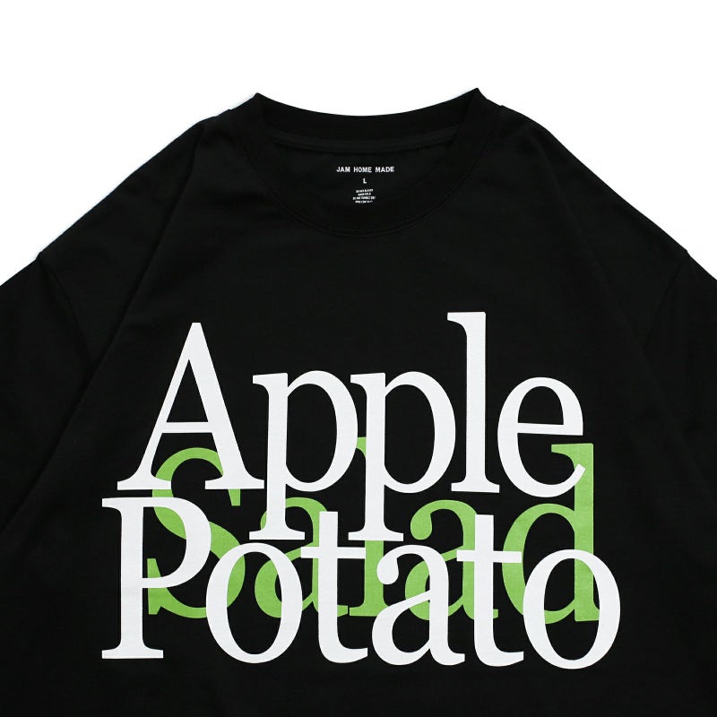ポリエステルのシワになりにくさ、乾きやすさと、綿のぬくもりと通気性・吸水性の良さ、静電気の起こりにくさなど、いいとこ取りした万能な生地を使用したジャムホームメイドのオリジナルボディのオリジナルボディのTシャツに、Appleがロゴやブランディングに使用したフォントで「Apple/Potato/Salad」をプリント。