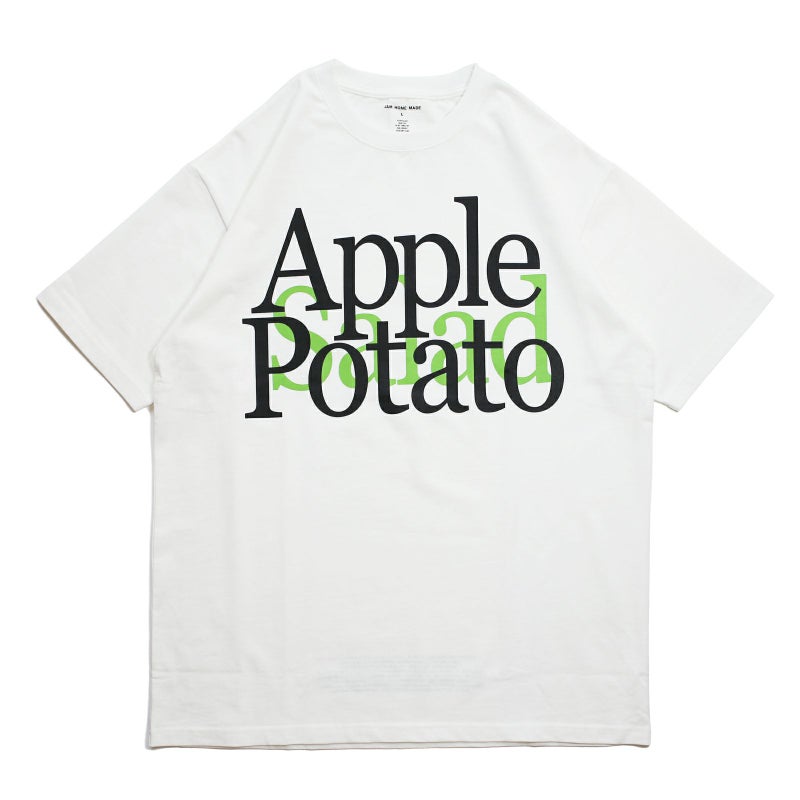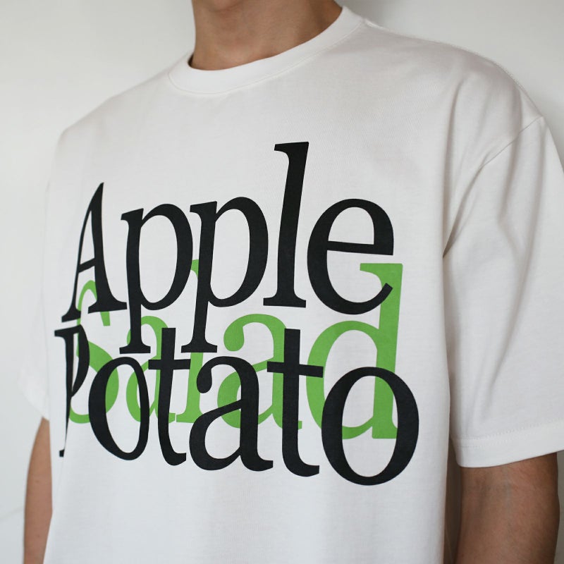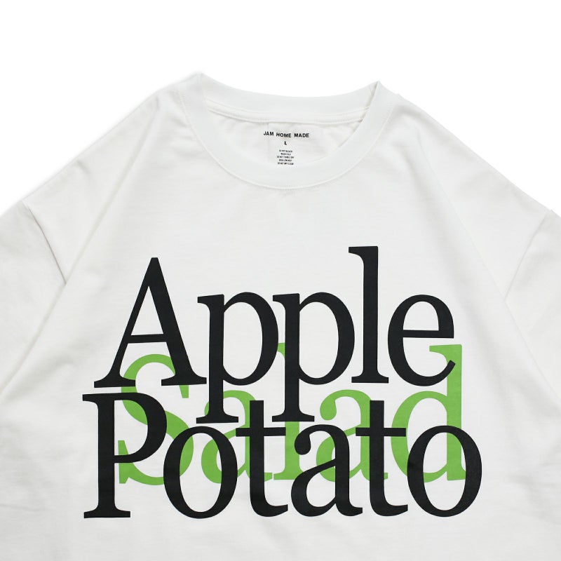 ポリエステルのシワになりにくさ、乾きやすさと、綿のぬくもりと通気性・吸水性の良さ、静電気の起こりにくさなど、いいとこ取りした万能な生地を使用したジャムホームメイドのオリジナルボディのオリジナルボディのTシャツに、Appleがロゴやブランディングに使用したフォントで「Apple/Potato/Salad」をプリント。