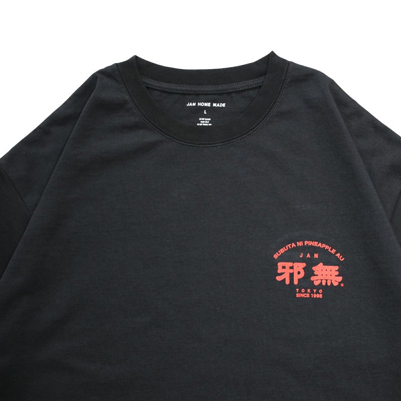 ポリエステルのシワになりにくさ、乾きやすさと、綿のぬくもりと通気性・吸水性の良さ、静電気の起こりにくさなど、いいとこ取りした万能な生地を使用したジャムホームメイドのオリジナルボディに強烈な原色と味わい深いフォントでロゴを加え、裏には本コレクションテーマをプリント。