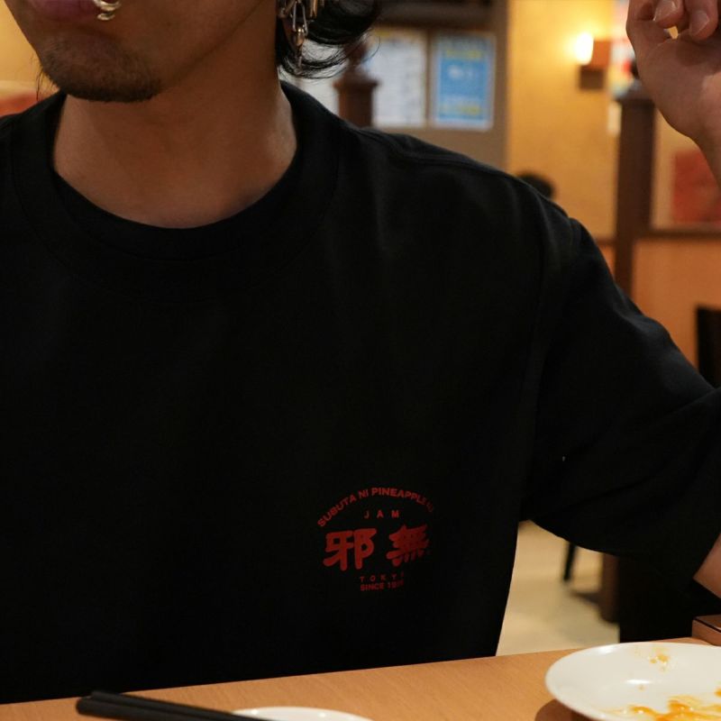 創業20年以上。ほぼすべての定食が1,000円弱というリーズナブルな価格、ボリュームはたっぷり。そしてオーダーから出てくるまでがとてもスピーディ。働く人、遊ぶ人の胃袋を満たし続けてきた、いわゆる町中華というジャンルに属す『 邪無 』という架空の街中華屋さんのスタッフTシャツ。