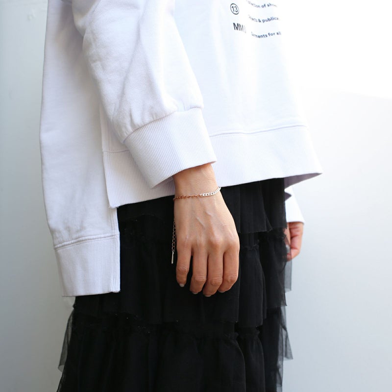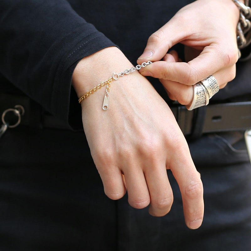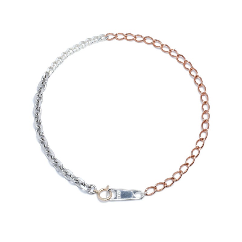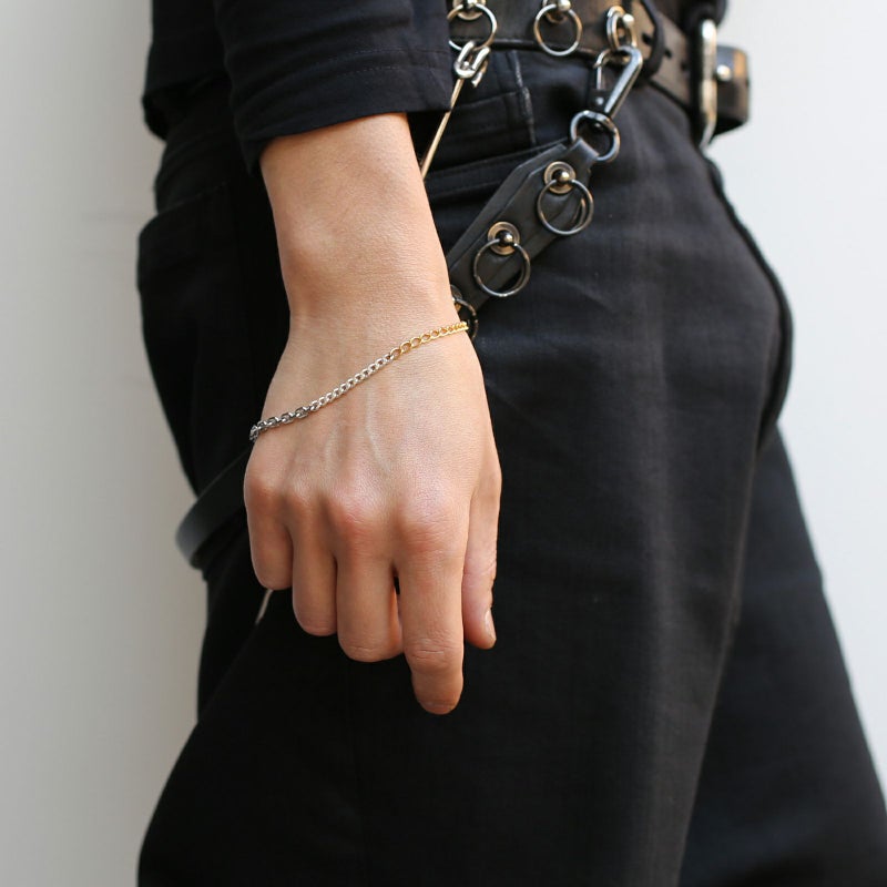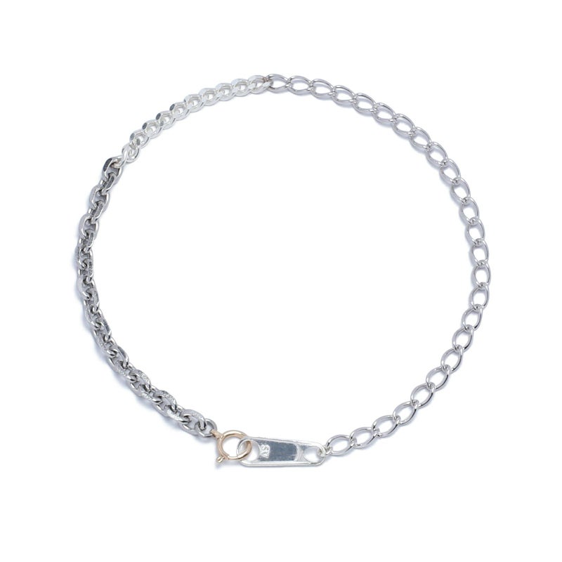 4つの素材(10K,SILVER925,SUS,BRASS)を用いて、ゴールドカラー/シルバーカラーのコンビネーションのチェーンブレスレットに仕上げました。