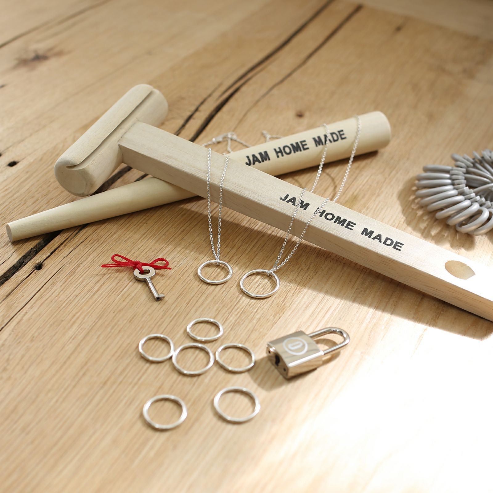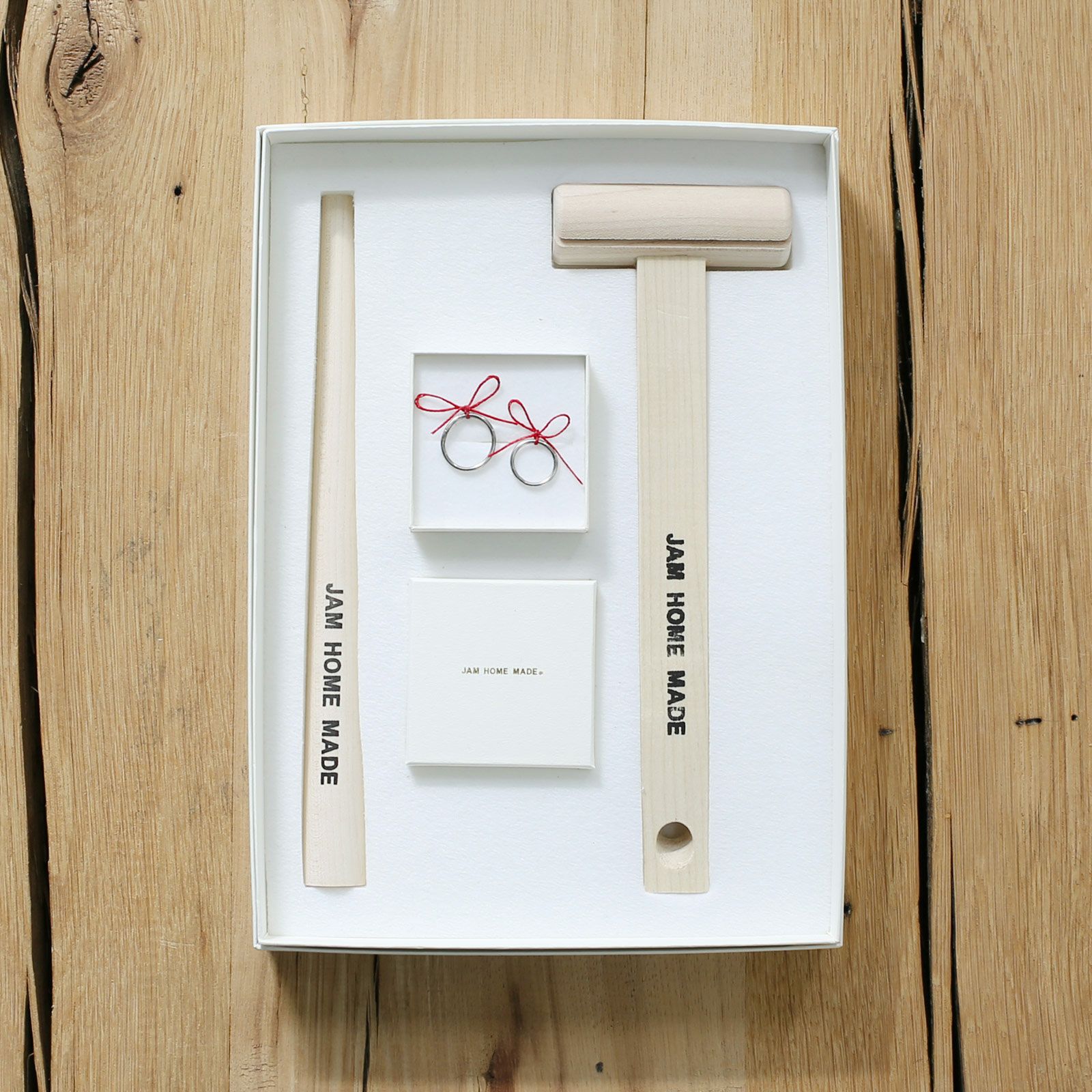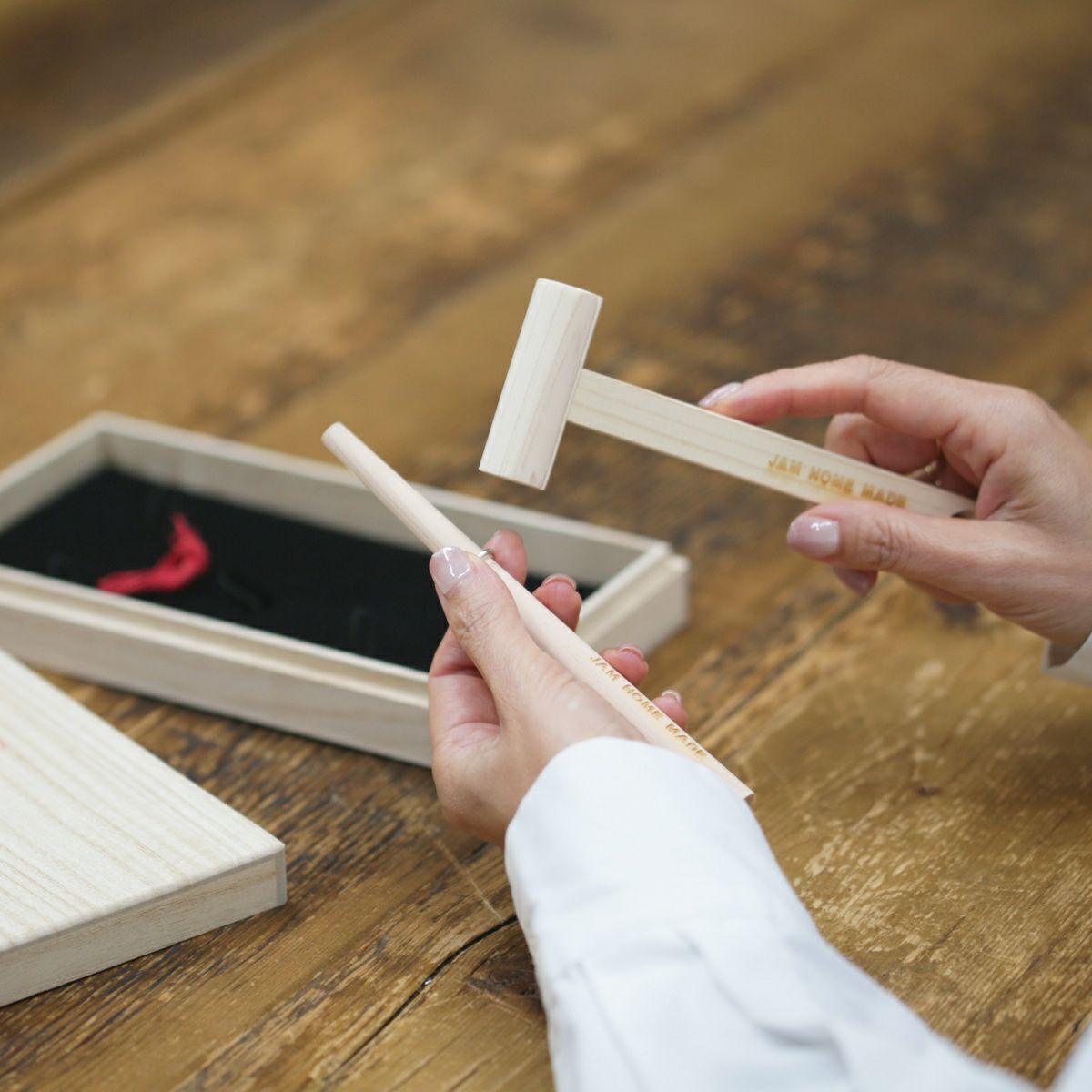 楕円に歪んだ指輪を、ハンマーと芯棒を使って真円に仕立てあげる『名もなき指輪』。専用の道具がセットになった大好評の「名もなき指輪キット」も販売中ですが、ジャムホームメイド東京店営業時間中はなんと、無料で「名もなき指輪」のペアリングをお作りいただけます。詳しくは店舗までお問い合わせくださいませ。