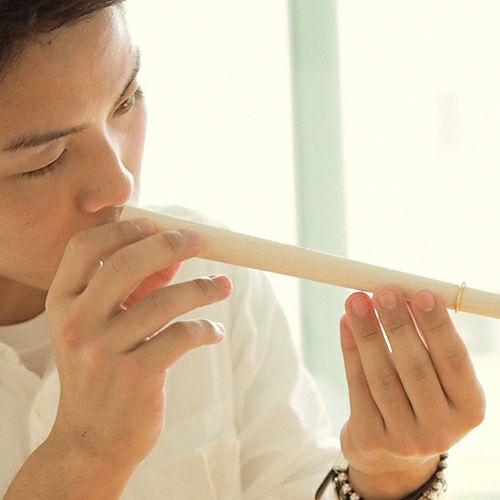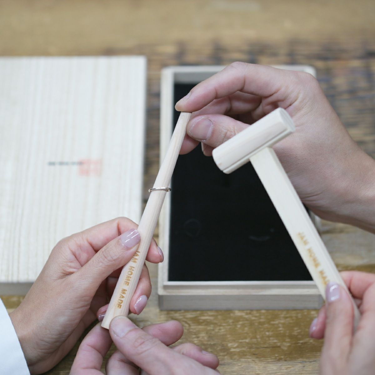 木芯棒にリングを通し、奥までしっかり入れ、棒をお腹で支えます。親指と人差し指で指輪を固定しながら叩きます。お互いの指輪を交換して作り合いましょう。